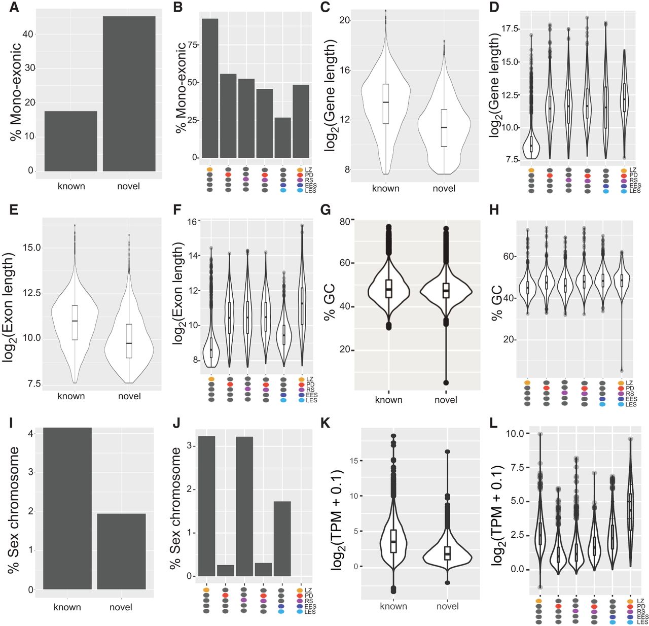 Characteristics of newly annotated spermatogenesis-expressed genes. (A,C,E,G,I,K) Comparisons between all novel to known genes. (B,D,F,H,J,L) Comparisons between classes of novel genes with different developmental expression patterns (indicated by colored ovals under the x-axes). (A,B) Bar plots showing percentage of identified genes containing only a single exon. (C–F) Violin plots showing distributions of log2 of gene length (C,D, including introns) or exon length (E,F). (G,H) Violin plots comparing distributions of GC% between different gene categories. (I,J) Bar plots showing fraction of genes mapping to the X or Y Chromosomes. (K,L) Violin plots comparing log2(transcripts per million[TPM] + 0.1) between different gene categories.