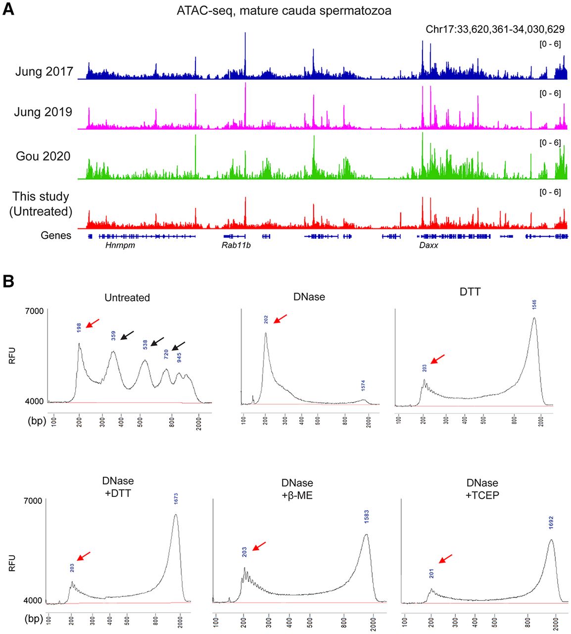 ATAC-seq profiles from sperm following DNase and DTT treatment. (A) Genome browser tracks for ATAC-seq data from untreated sperm (this study) and from three published ATAC-seq data sets for sperm (Jung et al. 2017, 2019; Gou et al. 2020). (B) Bioanalyzer traces of ATAC-seq sequencing libraries prepared from sperm samples pretreated with the indicated conditions before Tn5 transposition. Red arrows show ∼75-bp inserts (after accounting for sequencing adaptors) corresponding to open chromatin regions, and black arrows in “untreated” libraries show insert lengths corresponding to mono-, di-, and trinucleosome length inserts. Notable in all the DTT-treated libraries is a peak at ∼1.3 kb. This peak reflects a landscape of random insertions across the sperm genome, with the size of the insert being an artifact of the PCR conditions used in library preparation. We confirmed this by building a second set of ATAC-seq libraries in which the PCR extension time was extended to 2 min compared with 1 min in the libraries shown. Under these conditions, we find a ∼2.5-kb peak, confirming that PCR extension time is responsible for this peak location. (RFU) Relative fluorescence units.