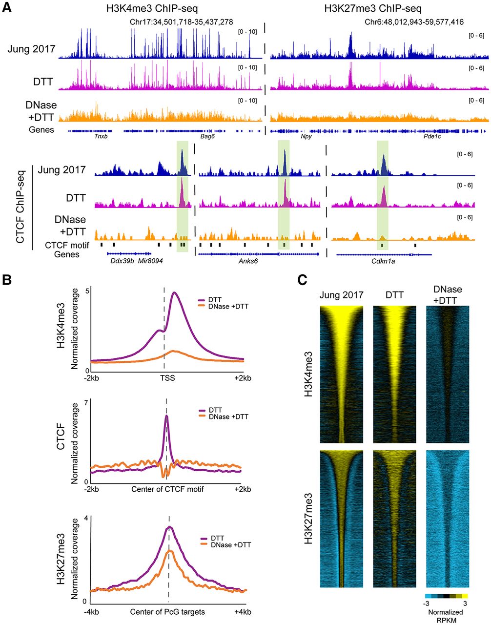 Histone modification profiling in DNase-treated sperm reveals a loss of specific signal. (A) Browser tracks for H3K4me3, H3K27me3, and CTCF ChIP-seq in sperm. In all three cases, the top panels show data from published sperm data sets (Jung et al. 2017), along with our data from DTT-treated and DNase + DTT-treated sperm underneath. (B) Metagenes aligned over the relevant peak locations (TSS, CTCF motif, and Polycomb-group [PcG] targets), showing H3K4me3, H3K27me3, and CTCF enrichment in our DTT-only and DTT + DNase data sets. (C) Heatmaps show H3K4me3 and K27me3 enrichment over all peaks from Jung et al. (2017), with data shown for Jung et al. alongside our DTT and DTT + DNase data sets.