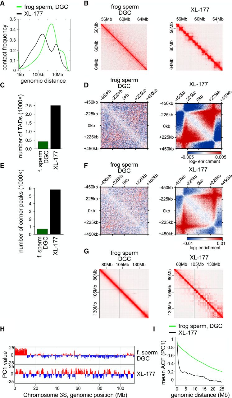The frog sperm genome is organized without TADs and corner peaks. (A) Contact frequency as a function of genomic distance for Xenopus laevis (frog) sperm enriched by density gradient centrifugation (DGC) compared with frog XL-177 cells. (B) Normalized Hi-C matrices for the same samples as in A in the region of Chr1S:55–65 Mb at 25-kb resolution. (C) Number of TADs called for the same samples as in A. (D) Aggregate contact frequencies (coverage and distance corrected) around the 135 550- to 650-kb-long TADs called in XL-177 cells, for the same samples as in A. (E) Number of corner peaks called for the same samples as in A. (F) Aggregate contact frequencies (coverage and distance corrected) around the 109 550- to 650-kb-long corner peaks called in XL-177 cells, for the same samples as in A. (G) Normalized Hi-C matrices for the same samples as in A in the region of Chr3L:70–150 Mb at 100-kb resolution. (H) Compartment tracks from principal component analysis for the same samples as in A. (I) The autocorrelation of the PC1 value as a function of genomic distance, for the same samples as in A.