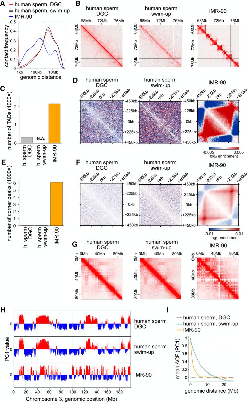 The human sperm genome is organized without TADs and corner peaks. (A) Contact frequency as a function of genomic distance for human sperm enriched by DGC and swim-up compared with human IMR-90 cells by Rao et al. (2014). (B) Normalized Hi-C matrices for the same samples as in A in the region of Chr3:67–77 Mb at 25-kb resolution with TAD calling indicated using black lines. (C) Number of TADs called for the same samples as in A. (N.A.) Artifacts in TAD calling owing to low sequencing depth. (D) Aggregate contact frequencies (coverage and distance corrected) around the 138 550- to 650-kb-long TADs called in IMR-90 cells, for the same samples as in A. (E) Number of corner peaks called for the same samples as in A. (F) Aggregate contact frequencies (coverage and distance corrected) around the 249 550- to 650-kb-long corner peaks called in IMR-90 cells, for the same samples as in A. (G) Normalized Hi-C matrices for the same samples as in A in the region of Chr3:0–90 Mb at 250-kb resolution. (H) Compartment tracks from principal component analysis for the same samples as in A. (I) The autocorrelation of the PC1 value as a function of genomic distance, for the same samples as in A.