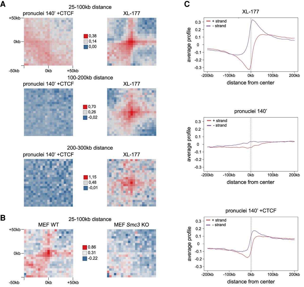 Addition of recombinant CTCF to Xenopus pronuclei fails to induce typical corner peak or TAD formation but generates weak contacts between Smc3 sites at very small distances. (A) Log2 of observed/control of aggregate contact frequencies between consecutive, directly adjacent Smc3 binding sites with a distance between the binding sites as indicated and 5-kb bin size, for demembranated frog sperm in Xenopus egg extract after 140 min (pronuclei 140′), pronuclei 140′ with addition of 50 nM CTCF protein, and frog XL-177 cells. To calculate control values, Smc3 binding sites were shifted by 10 Mb. (B) Log2 of observed/control of aggregate contact frequencies for mouse WT MEF cells and Smc3 KO MEF cells between consecutive, directly adjacent Smc3 binding sites in WT MEF cells with a distance between the binding sites of 25–100 kb and 5-kb bin size. Hi-C data by Banigan et al. (2023); ChIP-seq data from this study. To calculate control values, Smc3 binding sites were shifted by 10 Mb. (C) Average profiles of the directionality index for XL-177 cells, pronuclei 140′, and pronuclei 140′ with addition of 50 nM CTCF protein over unambiguously oriented CTCF binding sites detected in pronuclei 140′ +CTCF.
