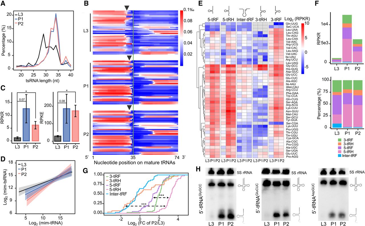 Expression level of 5′-tsRNAs increases during the larva-to-pupa transition. (A) The length distributions of mim-tsRNA-seq reads in L3 (black), P1 (blue), and P2 (red). (B) A heatmap showing the normalized coverage of mim-tsRNA-seq reads at each nucleotide position along each mature tRNA. Each line presents one tRNA isoacceptor and they are ranked alphabetically. Note that the 3′ ends of 5′ tsRNAs in L3 are generally trimmed by ∼2 nt more than those in P1 and P2 (arrows marking the average positions of the 3′ ends at each stage). (C) Quantifications of total tsRNAs in different developmental stages, performed using either 2S rRNA as an internal control (RPKR, reads per kilo 2S rRNA reads) or E. coli tRNALysUUU as a spike-in control (RPKE, reads per kilo E. coli tRNA reads). Error bars represent SEM (standard error of the mean) computed from two or three biological replicates. Asterisks indicate significant differences (Student's t-test P < 0.01 denoted as **). (D) Linear models of the relationships between tsRNA and tRNA abundances in L3 (black), P1 (blue), and P2 (red). The log-log slopes are 0.308, 0.416, and 0.604 for L3, P1, and P2, respectively. (E) A heatmap showing the tsRNA abundances (RPKR) in L3, P1, and P2 stages. The mim-tsRNA-seq reads mapped to all cytoplasmic tRNA genes were grouped into five subclasses: 5-tRF, 5-tRH, Inter-tRF, 3-tRH, and 3-tRF. (F) Absolute (top) and relative (bottom) quantifications of total tsRNAs in each of the five subclasses. 3-tRF (green), 3-tRH (orange), 5-tRF (purple), 5-tRH (pink), and Inter-tRF (blue). (G) Empirical cumulative distribution function (ECDF) of the dynamic changes (P2/L3) in tsRNA levels (measured as RPKR) of different subclasses. Kolmogorov–Smirnov tests against the differences between 5-tRH versus 5-tRF and 5-tRH versus 3-tRH P < 0.001 (***). (H) Northern blots using probes against the 5′ ends of tRNAAspGUC, tRNAGlyGCC, and tRNAGluCUC. Each experiment has two independent replicates with consistent results.