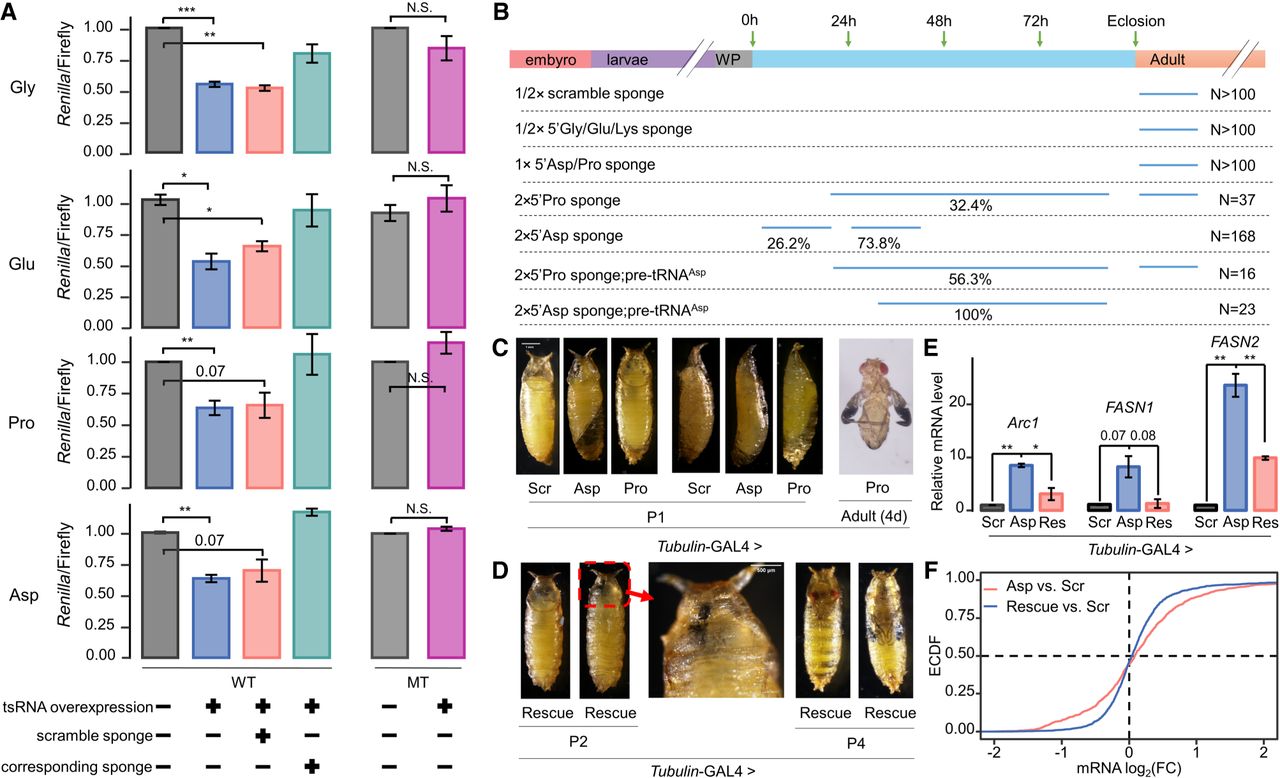 Evaluation of regulatory activities of 5′-tsRNAs in vitro and during development. (A) Normalized Renilla/Firefly reporter activities to assay target site-dependent regulation by 5′-tsRNAs. WT: Renilla reporter gene carrying three target sites of each tsRNA. The sequences were cloned from native genes carrying predicted target sites (Supplemental Fig. S9B). MT: Renilla reporter gene carrying three sites with scrambled sequences in the seed match. For 5′-tsRNAGlyGCC, 5′-tsRNAGluCUC, and 5′-tsRNAProUGG, the sites were placed in 3′ UTR; for 5′-tsRNAAspGUC, the sites were placed in CDS with the consideration of their higher inhibitory effects (Supplemental Fig. S7C). tsRNA overexpression: synthetic tsRNA mimic and the pAWH vector to express the corresponding pre-tRNA. tsRNA sponge: synthetic RNA sequence that is reversely complementary to the tsRNA. Scramble sponge: synthetic RNA sequence that is randomly scrambled from the sponge. See Supplemental Tables S2–S5 for the sequences. (B) Summary of the estimated lethality time based on the stage at which pupae stopped developing. For 5′-tsRNAGlyGCC, 5′-tsRNAGluCUC, 5′-tsRNALysUUU, and the scramble 5′-tsRNAAspGUC, Tubulin-GAL4-driven one or two copies of sponge elements did not show any observable phenotypes (N > 100). For Tubulin-GAL4-driven one copy of sponge element against 5′-tsRNAAspGUC and 5′-tsRNAProUGG, some mild traits were observed but all pupae emerged (N > 100). (C) The pupal lethality phenotype of Tubulin-GAL4-driven two copies of sponge elements against 5′-tsRNAAspGUC and 5′-tsRNAProUGG. All 5′-tsRNAAspGUC-sponge pupae (“Asp”; N = 168) did not survive beyond P2. 26.2% of them had an abnormal body curvature and died during P1. 73.8% showed a failure in head inversion and an improper air bubble location during P2. The 5′-tsRNAProUGG-sponge pupae (“Pro”; N = 37) showed high phenotypic heterogeneity. 32.4% of them proceeded through P1 but failed to eclose. 67.6% emerged with various defects such as un-spread wings 4 d after emergence. The Tubulin-GAL4-driven two copies of scramble sponge (“Scr”) was used as control, and all tested pupae (N > 100) emerged without observable defects. (D) Phenotypic rescue with pre-tRNAAspGUC. All rescued pupae (“Rescue”; N = 23) proceeded through P1 with finished head evert process and correct air bubble location. 43.5% of them lived to P4 as late pharate adults, but had leg malformation and did not eclose. (E) qRT-PCR confirming that the mRNA levels of three selected 5′-tsRNAAspGUC target genes were restored by pre-tRNAAspGUC. All samples were collected from P1 pupae. Arc1, FASN1, and FASN2 were selected because of their known expression and function during the larva-to-pupa transition. rp49 was used as internal control. Each experiment had two independent replicates. Error bars represent SEM, and Student's t-tests were used. (F) mRNA-seq confirming that the mRNA levels of 5′-tsRNAAspGUC target genes (N = 1411) were restored by pre-tRNAAspGUC. Kolmogorov–Smirnov test P-value = 10−11.