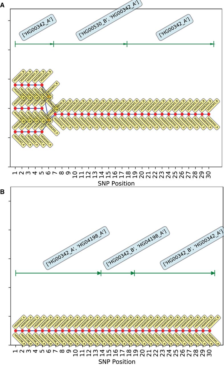 Consensus genotypic trajectories from PLIGHT_Iterative for the diploid mosaic genome of HG00360 + HG00342 across 30 SNPs in Chromosome 1, where the consensus score is evaluated by weighting the haplotypes in each trajectory in proportion to their occurrence across all three chromosomes. The composition of the best-fit pair of haplotypes at each locus is depicted by two yellow tags, one below and one above the red dots. (A) niter = 20, replicate 1; (B) niter = 30, replicate 1. Shown at the top of each panel are the most frequent haplotypes within each segment indicated. The second replicates of niter = 20 and niter = 30 are shown in the Supplemental Materials.