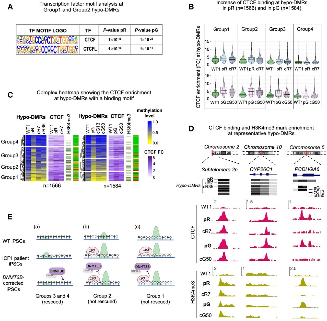 Abnormal CTCF binding at a small fraction of hypo-DMRs contributes to persisting hypomethylation. (A) Motif enrichment analysis of known TFs at hypo-DMRs with reduced DNMT3B binding and increased H3K4me3 levels. The panel corresponds to motifs enriched at the subset of hypo-DMRs corresponding to Groups 1 and 2 in pR (n = 1177) and pG (n = 1230) iPSCs, as shown in Figure 1B. (B) Violin and boxplot representation of CTCF enrichment (IP/input) calculated across hypo-DMRs with a CTCF HOMER motif in WT1, ICF1 iPSCs, and one of their corrected clones (cR7 for pR and cG50 for pG). To quantify the statistical significance of the increased CTCF enrichment in Groups 1 and 2 compared to Groups 3 and 4, we calculated the difference between ICF1(FC) – WT(FC) and corrected clone (FC) – WT1(FC) for each group and applied nonparametric paired Wilcoxon test with one-sided alternative and BH-FDR correction. We then computed the effect size between the differences (for pR, G1 = 0.38; G2 = 0.26; G3 = 0.14; G4 = 0.03; for pG, G1 = 0.63; G2 = 0.48; G3 = 0.35; G4 = 0.11). (C) A complex heatmap showing the integration of methylation level and CTCF ChIP-seq enrichment (FC) across pR and pG ICF1 hypo-DMRs containing CTCF binding motifs. The presence of H3K4me3 enriched peaks proximal to hypo-DMRs (within 1 kb) and the status of hypo-DMR correction is depicted on the right. The proportion of H3K4me3 enriched peaks out of the total number of hypo-DMRs in each group is higher in Group 1 (pR = 137 [40%]; pG = 145 [51%]) and Group 2 (pR = 140 [31%]; pG = 150 [50%]) compared to Group 3 (pR = 98 [20%]; pG = 85 [17%]) and Group 4 (pR = 46 [13%]; pG = 50 [12%]); one-sided Fisher's exact test: Group 1 versus Group 3 and versus Group 4 (P-adj < 0.0001), and Group 2 versus Group 3 (P-adj < 0.001) and Group 4 (P-adj < 0.0001). (D) Genome browser views of representative regions characterized by abnormal increase of CTCF binding, as observed by ChIP-seq in WT, ICF1, and corrected iPSCs (cR7 for pR and cG50 for pG). Green tracks represent H3K4me3 enrichment levels in iPSCs. (E) Graphical representation of hypo-DMRs identified in ICF1 iPSCs and clustered in Groups 1–4 based on their DNA hypomethylation level, as reported in Figure 4A: (a) Rescued hypo-DMRs of Groups 3 and 4, showing high methylation and low H3K4me3 levels (green peak) in WT iPSCs, mild hypomethylation and H3K4me3 increase in ICF1 iPSCs, and regain of normal DNA methylation and H3K4me3 levels upon restoration of DNMT3B activity by gene editing; (b) unrescued hypo-DMRs of Group 2, showing initial intermediate/high DNA methylation levels and H3K4me3-enrichment in WT iPSCs, severe hypomethylation, high H3K4me3 increase in ICF1 iPSCs and/or abnormal CTCF binding, which persist in the corrected clones; (c) unrescued hypo-DMRs of Group 1, showing initial low DNA methylation level and high H3K4me3-enrichment in WT iPSCs, severe hypomethylation, high H3K4me levels and/or abnormal CTCF binding in ICF1 iPSCs, which are resistant to correction as in Group 2.