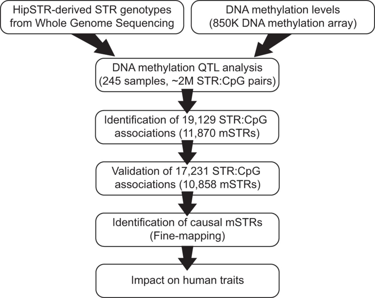Overview of DNA methylation QTL analysis study design. Schematic summarizing the main steps used to identify functional STRs that modulate local DNA methylation profiles. Briefly, we performed (1) pairwise association analysis between STR length and DNA methylation levels within ±50 kb in a discovery cohort, (2) replication analysis in a second independent cohort, (3) fine-mapping analysis to define a set of causal mSTRs that act as DNA methylation regulators in cis, and finally (4) evaluation of the contribution of fine-mapped mSTRs to human traits by integration of tag SNVs with published GWAS signals.