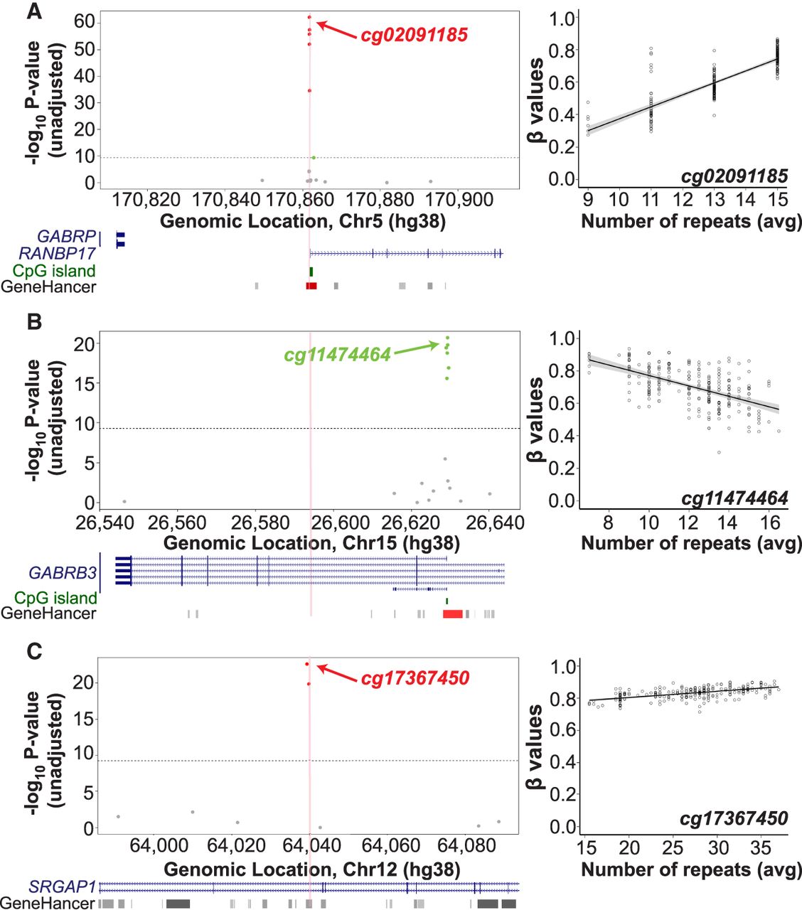 Examples of cis associations between STR length and local CpG methylation levels. Each Manhattan plot shows the association signals with CpG methylation ±50 kb of a genotyped STR: (A) Chr 5: 170,861,820–170,861,870, (B) Chr 15: 26,593,982–26,594,004, and (C) Chr 12: 64,039,629–64,039,660. Each circle represents a CpG, with significant associations shown either in red (positive correlations) or green (negative correlations). Panels A and B show a consistent positive and negative correlation between the STR length and β-values of multiple CpGs that map in the promoter region of RANBP17 and GABRB3, respectively. Panel C shows a consistent positive correlation between the STR length and β-values of two CpGs located at an enhancer. The location of the STR is shown by the vertical red line. The horizontal gray dashed line indicates the genome-wide significance threshold (Bonferroni-adjusted P < 0.001). Manhattan plots are annotated with genes (blue), CpG islands (green), enhancers (gray bars), and promoters (red bars) using NCBI RefSeq, cpgIslandExt, and GeneHancer tracks from the UCSC Genome Browser, respectively. In each case, the right panel shows a scatter plot of the average diploid STR genotypes (x-axis) and methylation β-values (y-axis) of the strongest associated (by P-value).