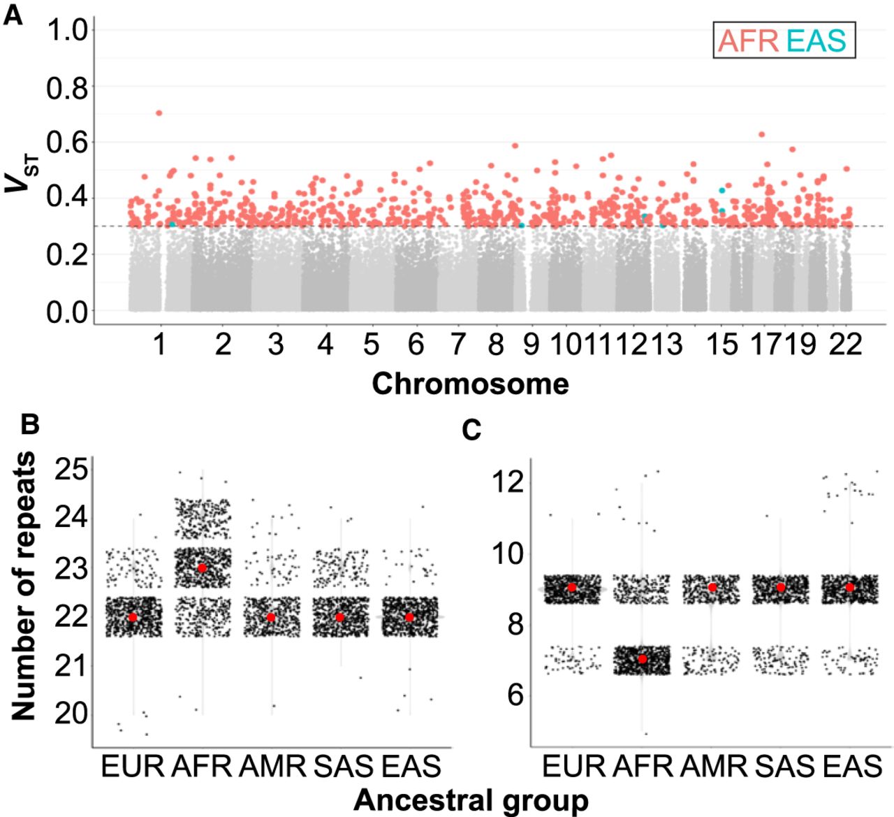 Population stratification of fm-mSTRs. (A) Manhattan plot showing the highest VST index for 126,676 polymorphic STRs across the five tested superpopulations. For each STR and ancestry, VST index was calculated using the individual allele size. VST values are color-coded according to ancestry when VST > 0.3 (gray dashed line). (B,C) The allele size distribution for di- and pentanucleotide STRs located at the promoter and 5′ UTR regions of the CLEC17A (B; Chr 19: 14,582,958–14,582,997) and CRYBB2P1 (C; Chr 22: 25,448,062–25,448,099) genes, respectively. For each ancestral group, median of allele size is depicted by red dot. (EUR) European, (AFR) African, (AMR) American, (SAS) South Asian, (EAS) East Asian.