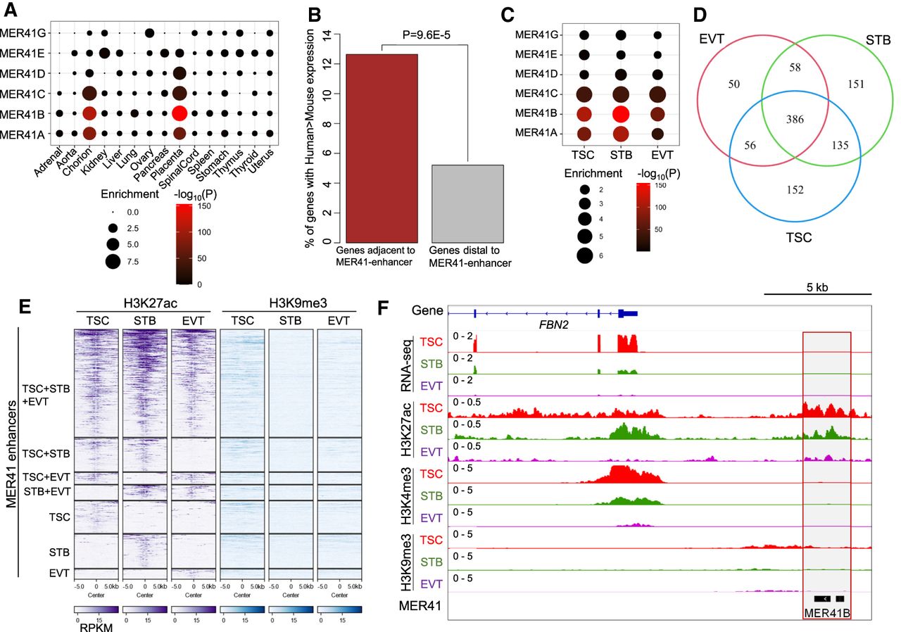 Characterization of MER41-enhancers in different human tissues and trophoblast cells. (A) Enrichment of MER41 subfamilies in the epigenetically annotated enhancers for different human tissues. Enhancers were annotated as H3K27ac peaks that are more than 500 bp away from any TSSs. (B) The bar plot shows that, relative to distal genes, higher proportion of MER41-enhancer adjacent genes have increased expression in human placenta relative to mouse. MER41-enhancer adjacent genes are defined as those with their TSSs within 50 kb from any MER41-enhancers. P-value calculated using Fisher's exact test is indicated. (C) Enrichment of MER41 subfamilies in the enhancers annotated for human TSC, STB, and EVT. (D) Overlapping of the MER41-enhancers annotated for human TSC, STB, and EVT. (E) Heatmap shows the H3K27ac and H3K9me3 intensity for the shared or cell-specific MER41-enhancers for different human trophoblast cells. (F) IGV tracks showing the transcriptomic and epigenomic profiles surrounding the representative MER41-enhancer adjacent to FBN2.
