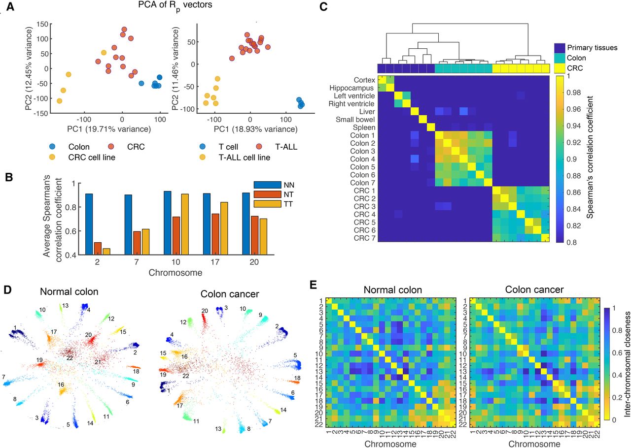 CCN hierarchy disorder in cancer. (A) Principal component analysis (PCA) for RP vectors of samples in CRC and T-ALL data sets. The PCA is conducted on RP values of all 40-kb bins in the entire genome. Each point represents a sample in PC space defined by the first two principal components. (B) Bar graphs showing the average Spearman's correlation coefficients of RP between all pairs of normal colons (NN), between all pairs of colon tumors (TT), and between each normal colon and each colon tumor (NT). (C) Rank similarity in RP among samples including primary tissues, normal colons, and colon tumors. Each unit color in the heatmap represents the value of Spearman's correlation coefficient between RP vectors of corresponding sample pair. Samples were clustered using the Ward's hierarchical clustering method. The heatmap was derived from the intrachromosomal CCNs of Chromosome 10, therein the normal colon and tumor sets both have conserved hierarchy order as shown in B. (D) Embedded structures of whole chromatin contact networks for a pair of normal colon (left) and colon tumor (right) of one individual. Chromosome numbers were annotated alongside corresponding chromosomes in embedded structures. (E) Interchromosomal closeness matrices corresponding to (D). Each heatmap entry ranging from 0 to 1 indicates the closeness between each pair of chromosomes.