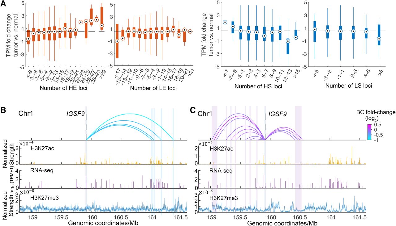 Correlation between gene expression changes and rewired contacts in cancer. (A) In each box, the x coordinate is the number of loci that a gene significantly (P < 0.05) lost or gained contacts with from normal colon to CRC; the y coordinate is TPM fold change (log2). A negative or a positive x coordinate means losing or gaining contacts with loci of corresponding type. HE and LE denote loci containing H3K27ac-peaks (enhancer-like) in the highest hierarchy class and those in the lowest hierarchy class, whereas HS and LS denote H3K27me3-rich (silencer-like) loci in the highest hierarchy class and those in the lowest hierarchy class, respectively. Changes of genomic tracks from normal colon (B) to colorectal cancer (C) for the gene IGSF9. Significantly (P < 0.05) changed Hi-C contacts from normal colon to colorectal cancer at the gene promoter bait are shown in the top panel, where decreased and increased contacts are shown in panels B and C, respectively. The colors of contact traits represent betweenness centrality (BC) fold-change from normal colon to colorectal cancer. The second and the third panels are H3K27ac signals and RNA-seq data, respectively. TPM is averaged in the normal colons and the CRC samples from the TCGA database. The bottom panels are H3K27me3 signals. The ChIP-seq signals were normalized by corresponding sequencing depth.
