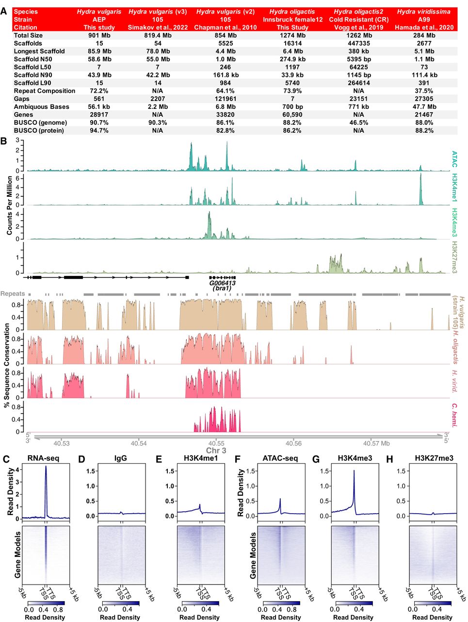 New genome assemblies provide improved resources for Hydra molecular biology research. (A) The Hydra vulgaris strain AEP and Hydra oligactis genome assemblies presented in this study are marked improvements on the previously available reference genomes for their respective species. (B) Representative plot of CUT&Tag, ATAC-seq, and genomic conservation tracks centered on the hybra1 gene (Technau and Bode 1999). For the sequencing data, each track represents the signal from pooled biological replicates for the specified library type. A plot of the same locus that includes separate tracks for each CUT&Tag and ATAC-seq biological replicate is presented in Supplemental Figure S4. (C–H) Read distribution for sequencing data centered on AEP assembly gene models. (C) Whole-animal RNA-seq data are strongly enriched in predicted coding sequences. (D) Control IgG CUT&Tag reads show minimal enrichment in or around genes. (E) H3K4me1 is enriched in promoter-proximal regions, but only weakly enriched at transcription start site (TSS). (F) ATAC-seq is enriched at TSS, but also shows some enrichment in more distal regions, likely because ATAC-seq targets both promoters and enhancers. (G) H3K4me3 is strongly enriched at the TSS. (H) H3K27me3 shows minimal or no enrichment near transcribed genes. (TTS) Transcription termination site.