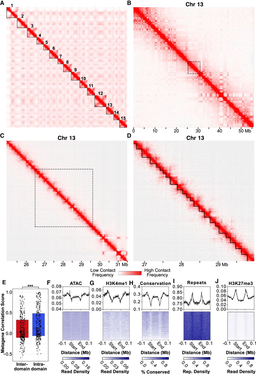 Hi-C data reveal hierarchical chromatin architecture in the Hydra genome. (A) Hi-C contact map for the H. vulgaris strain AEP assembly reveals 15 pseudochromosomes with high levels of both inter-chromosomal interactions between presumptive centromeric regions and intra-chromosomal interactions between centromeric and telomeric regions. (B) The chromatin interaction map for Chromosome 13 reveals megabase-scale chromatin compartments. The black dotted lines indicate the region visualized in the subsequent figure panel. (C) Kilobase-scale interaction domains can be found within a single megabase-scale compartment. (D) Representative depiction of predicted kilobase-scale chromatin interaction domains in Hydra (black lines). (E) Boxplot/scatterplot depicting the correlation in expression for adjacent gene pairs show that gene pairs within the same domain (intra-domain pairs) were significantly more similar than pairs that spanned a domain boundary (inter-domain pairs; Welch two-sample t-test P-value = 6.93 × 10−5). (F–J) Predicted domain boundaries fall within regions of heterochromatin. Domain boundaries are associated with reduced chromatin accessibility (F), H3K4me1 (G), and sequence conservation (H) and with elevated repeat element density (I) and H3K27me3 (J).