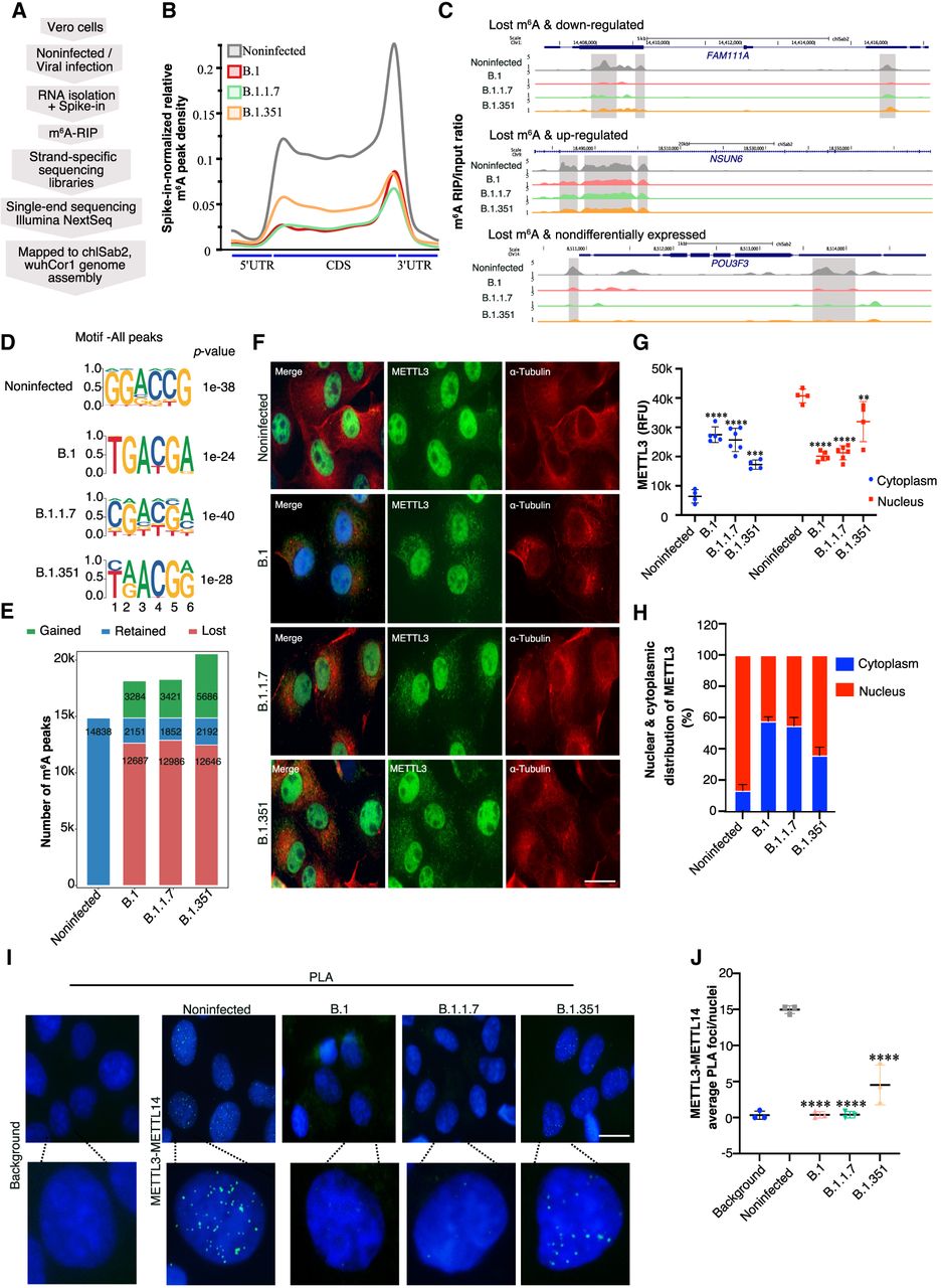 Variant-specific changes in cellular RNA m6A level after viral infection. (A) Flow chart describing the m6A RIP-seq protocol. (B) Metagene analysis showing spike-in normalized relative m6A peak density at host genes in noninfected and SARS-CoV-2-infected Vero cells (variants as specified by colors). (C) Genome browser screenshots showing the ratio of m6A RIP/input for three different genes in noninfected and SARS-CoV-2-infected (variants as specified) Vero cells. Ratio tracks were calculated using spike-in normalized counts per million (CPM). m6A peak regions identified using the MACS peak caller software in noninfected cells are highlighted using gray boxes. (D) Identified motifs from de novo motif analysis of peaks in noninfected and infected cells. (E) The total number of peaks classified as retained, gained, or lost postinfection with the SARS-CoV-2 variants are indicated and compared with the noninfected condition. (F–H) METTL3 localization. (F) METTL3 and α-tubulin coimmunostaining in Vero cells that were either noninfected or infected with SARS-CoV-2 variants (as denoted). Scale bar is 20 μm. (G) METTL3 intensities (in relative fluorescence units [RFU]) derived from the immunostainings performed in F. METTL3 RFU in the nucleus (red) and cytoplasm (blue) were estimated using ImageJ, using DAPI marking the nucleus and α-tubulin staining the cytoplasm as references. Data are shown as mean ± SD. Data presented from multiple experiments with the total number of cells counted, n = <70. One-way ANOVA test was performed; (**) P < 0.01, (***) P < 0.001, (****) P < 0.0001. (H) Distribution of METTL3 in the nucleus and cytoplasm calculated from the percentage of RFU intensities measured as described in G. Data are shown as mean ± SD. (I,J) METTL3–METTL14 interaction. (I) Proximity ligation assay (PLA) in noninfected and SARS-CoV-2-infected Vero cells (variants as indicated) depicting METTL3 and METTL14 PLA foci in the nucleus (marked by DAPI). The background control shows PLA with only the METTL3 antibody. Scale bar is 20 μm. (J) Quantification of METTL3–METTL14 PLA foci as detected in I. The number of PLA foci/nuclei are shown as mean ± SD. Data presented from multiple experiments with the total number of cells counted, n = <100. One-way ANOVA test was performed; (****) P < 0.0001.