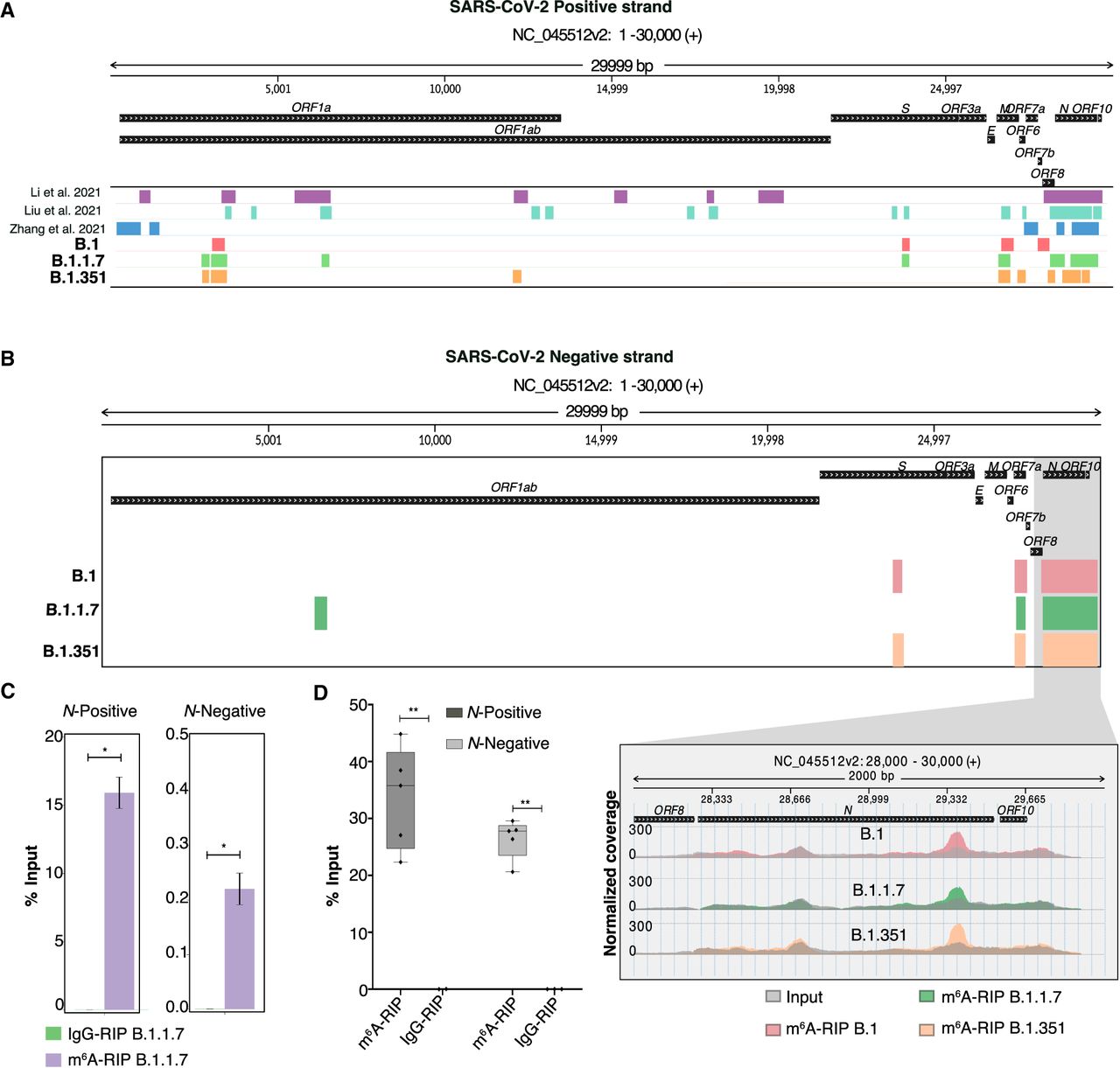 SARS-CoV-2 genomic RNA contains m6A modification. (A) Identified m6A peaks on SARS-CoV-2 positive strands from B.1, B.1.1.7, and B.1.351 variants are shown. The m6A peaks in the positive strand of SARS-CoV-2 RNA from publicly available data. (B) m6A peaks on the SARS-CoV-2 negative strand. The presence of m6A peaks in the N gene region is highlighted, and normalized coverage is shown on the panel below. (C,D) m6A-RIP qPCR data showing enrichment of N gene region in both the positive strand and the negative strand of viral RNA. (C) Twenty-four hours postinfection with B.1.1.7 in Vero cells; data are represented as a percentage of input, and IgG was used as the negative control. Statistics: two-tailed paired t-test, n = 3; (*) P < 0.05. (D) m6A-RIP qPCR data showing enrichment of the N gene region in both the positive strand and the negative strand of viral RNA from the infected patient samples (n = 5). Data are represented as a percentage of input. IgG was used as a negative control. Statistics: two-tailed paired t-test; (**) P < 0.01.