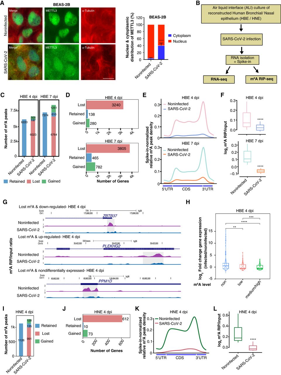 Loss of m6A in human airway epithelia after SARS-CoV-2 infection. (A, left) METTL3 localization in BEAS-2B cells postinfection with SARS-CoV-2. The scale bar is 20 μm. (A, right) The percentage distribution of METTL3 in the nucleus and cytoplasm was calculated using ImageJ with help of DAPI marking the nucleus and α-tubulin staining the cytoplasm. Data are shown as mean ± SD. Data presented from multiple experiments with the number of cells counted, n = <300. Unpaired t-test; (****) P < 0.0001. (B) Flow chart describing the experimental design for SARS-CoV-2 infection of reconstructed human bronchial/nasal epithelium at ALI. (C) Total number of m6A peaks classified as retained, gained, or lost, after 4- or 7-d post infection (dpi) with SARS-CoV-2, compared with noninfected HBE. (D) Bar plots representing the number of genes that lost, gained, or retained m6A in HBE after 4 and 7 dpi. (E) Metagene plots showing spike-in normalized relative m6A peak density distribution at host genes in noninfected and SARS-CoV-2-infected HBE cells at 4 and 7 dpi. (F) Boxplot showing log2 ratio of m6A signal over input obtained from spike-in normalized CPM data at lost m6A peak regions (±125 bp from m6A peak submit) taken from panel C at 4 and 7 dpi in HBE. Statistical significance was calculated using the Wilcoxon test; (****) P < 0.0001. (G) Genome browser screenshots showing the ratio of m6A RIP/input for three different genes in noninfected and SARS-CoV-2-infected HBE at 4 dpi. Ratio tracks were calculated using spike-in normalized CPM. m6A peak region identified using MACS peak caller in noninfected cells are highlighted using the gray box. (H) log2 fold-change distributions of differentially expressed genes in HBE at 4 dpi, categorized according to their m6A level: non, low, medium/high. Statistical significance was calculated using the Wilcoxon test; (**) P < 0.01, (***) P < 0.001, (****) P < 0.0001. (I) Total number of m6A peaks classified as retained, gained, or lost, after 4 dpi with SARS-CoV-2 compared with noninfected HNE. (J) The number of genes that lost, gained, or retained m6A in HNE post-SARS-CoV-2 infection. (K) Metagene plots showing spike-in normalized relative m6A peak density distribution in noninfected and SARS-CoV-2-infected HNE. (L) Boxplot showing log2 ratio of m6A signal over input obtained from spike-in normalized CPM data at lost m6A peak regions (±125 bp from m6A peak submit) taken from panel I at 4 dpi in HNE. Statistical significance was calculated using the Wilcoxon test; (****) P < 0.0001.