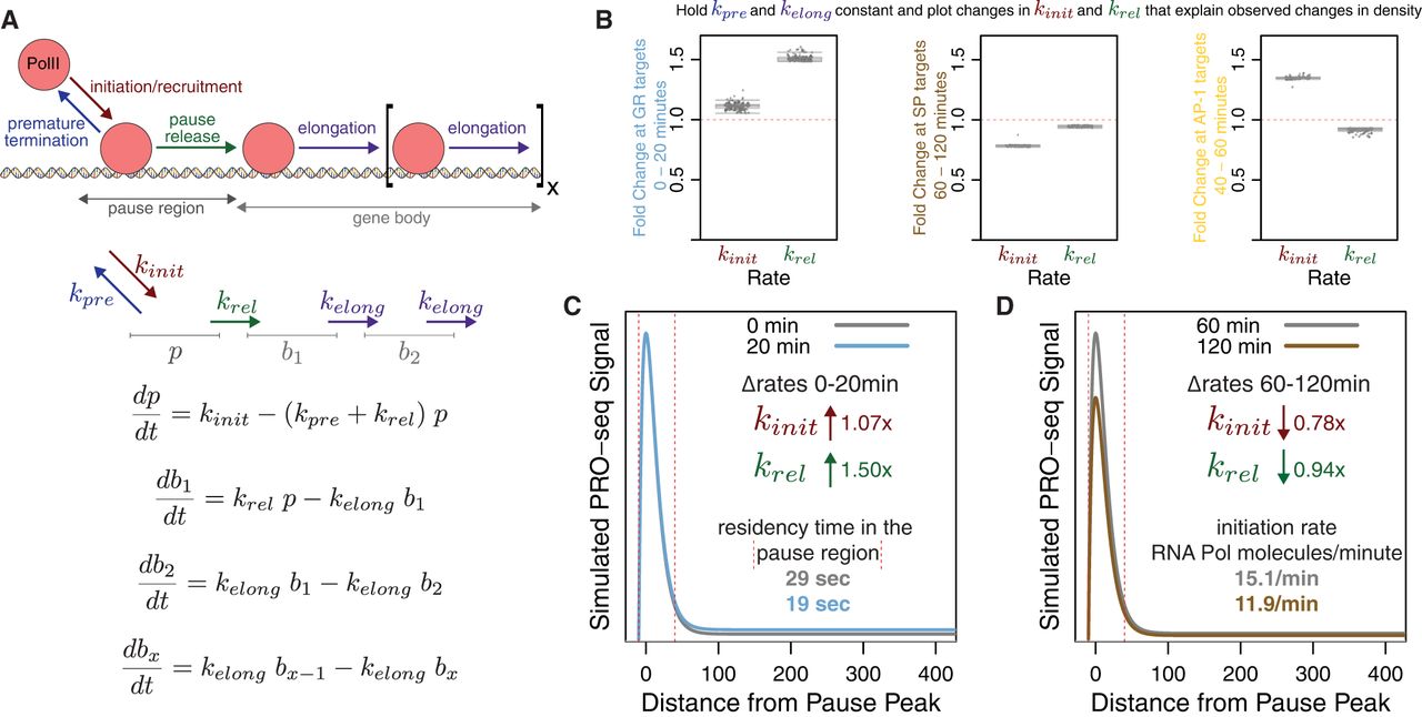 TFs induce changes to transcriptional rate constants. (A) The compartment model of transcription contains rate constants for RNA polymerase II (Pol II) initiation/recruitment, premature termination, pause release, and elongation. Polymerase occupancy in the pause or gene body compartment is measured directly from PRO-seq. Differential equations relate rate constants to the rate of change of polymerase density in the compartments. (B) We use the compartment model to estimate how rate constants change between 0 and 20 min for the 174 genes regulated solely by GR (left), 60 and 120 min for the 1127 genes regulated by SP (middle), and 40 and 60 min for the 1224 genes regulated by AP-1 (right). For each estimation, we hold kpre and kelong constant and calculate values of kinit and krel that fit the observed occupancy in the pause and body regions. (C,D) We simulated composite profiles for a set of parameters from B, left and middle.