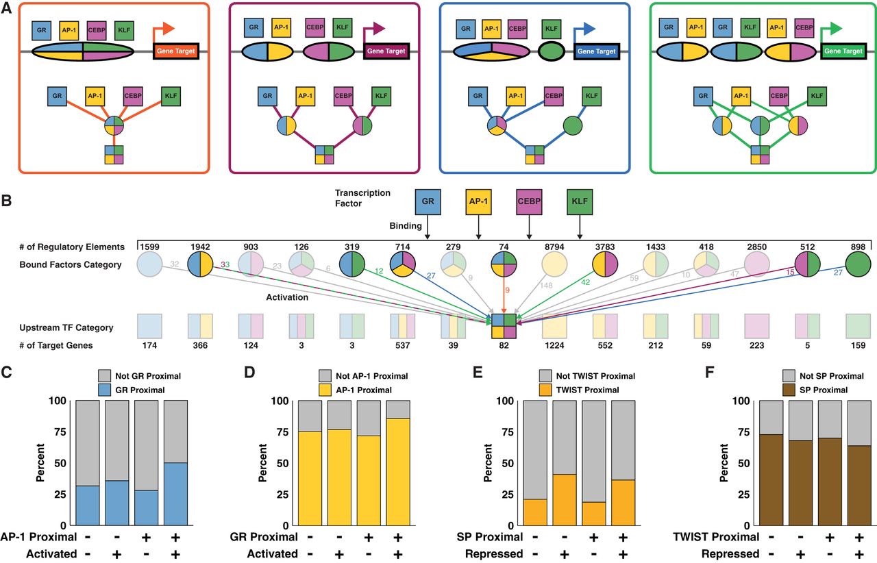 TFs bind REs and activate genes individually and combinatorially. (A) Schematics and modular networks illustrate four variations in AP-1, CEBP, GR, and KLF binding patterns that can lead to activation of gene targets: All four factors bind to a single RE (orange); two REs, each bound by two factors (purple); three factors bind one RE and one factor binds another (blue); and a more complex combination with redundant factor contributions at multiple REs (green). (B) A wide network depicts cooperation between TFs. Top squares indicate GR, AP-1, CEBP, and KLF TF families. Second row circles represent 15 classes of REs, each bound by a different combination of factors. Third row squares represent 15 classes of genes, each regulated by a different combination of factors. There are multiple potential combinations of REs that can produce the same gene class, as illustrated in A. The middle square representing the 82 genes activated by all four factors is an example of variable regulatory combinations. Colored arrows and numbers correspond to RE combinations as depicted in A. (C) Genes were sorted into categories based on proximity to AP-1 motifs, proximity to GR motifs, and activation status. We calculated 95% confidence intervals for odds ratios based on contingency tables consisting of genes stratified by their proximity to inferred AP-1 and GR REs and by whether the genes were dynamic. The confidence interval for genes that are not proximal to inferred AP-1 REs is 0.97 to 1.49. The confidence interval for genes that are proximal to inferred AP-1 REs is 2.3 to 2.89. The increase in odds ratio prediction suggests that activated genes proximal to AP-1 are significantly more likely to be proximal to GR than are nonactivated genes. (D) The confidence interval for genes not proximal to GR is 0.96 to 1.27. The confidence interval for genes proximal to GR is 1.94 to 2.87. Again, the increase indicates that AP-1 and GR factors coordinate to activate transcription. (E) The fraction of repressed genes proximal to TWIST increases regardless of the presence of SP with odds ratio confidence intervals of 2.2–3.07 and 2.21–2.79 when not proximal and proximal to SP peaks, respectively. (F) We find a lower proportion of repressed genes proximal to SP motifs in both the presence and absence of TWIST. The odds ratio confidence intervals do not change with the presence of TWIST, going from 0.71–0.89 to 0.64–0.9 when in proximity to predicted TWIST REs.