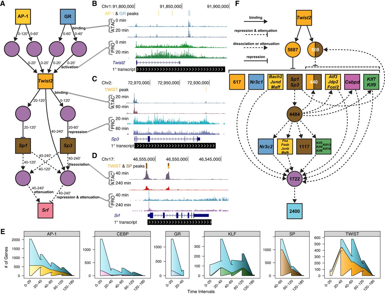 Variations in TF gene expression lead to downstream changes in accessibility and transcription. (A) A deep network highlights temporal components of the regulatory cascade. Node and edge characteristics are illustrated as in Figure 4. In addition, we added time interval attributes to respective edges to indicate when REs and genes are changing. (B–D) UCSC Genome Browser shots indicate accessibility and peaks (top three tracks), as well as nascent transcription (next two tracks) dynamics between the indicated time points. (E) Wedged bar plots quantify the regulatory kinetics across the time course for indicated factors. The x-axis intervals represent the time range in which the indicated number (y-axis) of genes are regulated (connected in the network) by the specified factor. Wedges between bars indicate carryover elements from previous time interval, and the outer “wings” represent elements that are not included in the previous time interval. The top shaded blue wedges represent genes regulated by multiple factors; bottom wedges represent genes that are solely regulated by the indicated factor. (F) A Twist2-centric network illustrates the high connectivity and influence of Twist2.