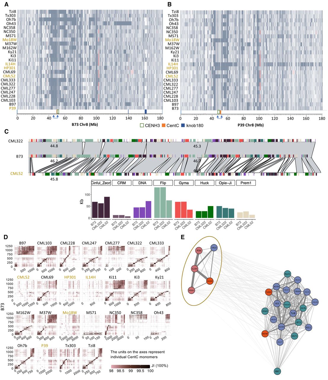 Cenhaps on Chromosome 8. (A) Alignments between NAM lines and B73 over Chromosome 8. Syntenic aligned regions (gray) and inverted segments (red) are shown. Blue arrows show the cenhap region with exceptional divergence. (B) Alignments between NAM lines and P39 over Chromosome 8. Annotation is the same as A. (C) Pairwise alignments and TE comparisons between CML322, CML52, and B73 over an ∼1 Mb region of Chromosome 8. Total kb of major TE families are shown below, in colors that match the annotation in the main panel (see Supplemental Fig. S9 for a more detailed view of TE subfamilies). This region does not include the CENH3 or CentC domains. (D) Pairwise alignments between NAM lines and B73 over CentC arrays on Chromosome 8. x- and y-axes show CentC monomers, and color intensity reflects the Jaccard index (JI) between each monomer pair. The non-B73 haplotypes are shaded in olive. (E) Clustering of CentC arrays on centromere 8. The colors over inbred names indicate varieties of corn: northern flint (pink), temperate (blue), mixed (red), and tropical (green).