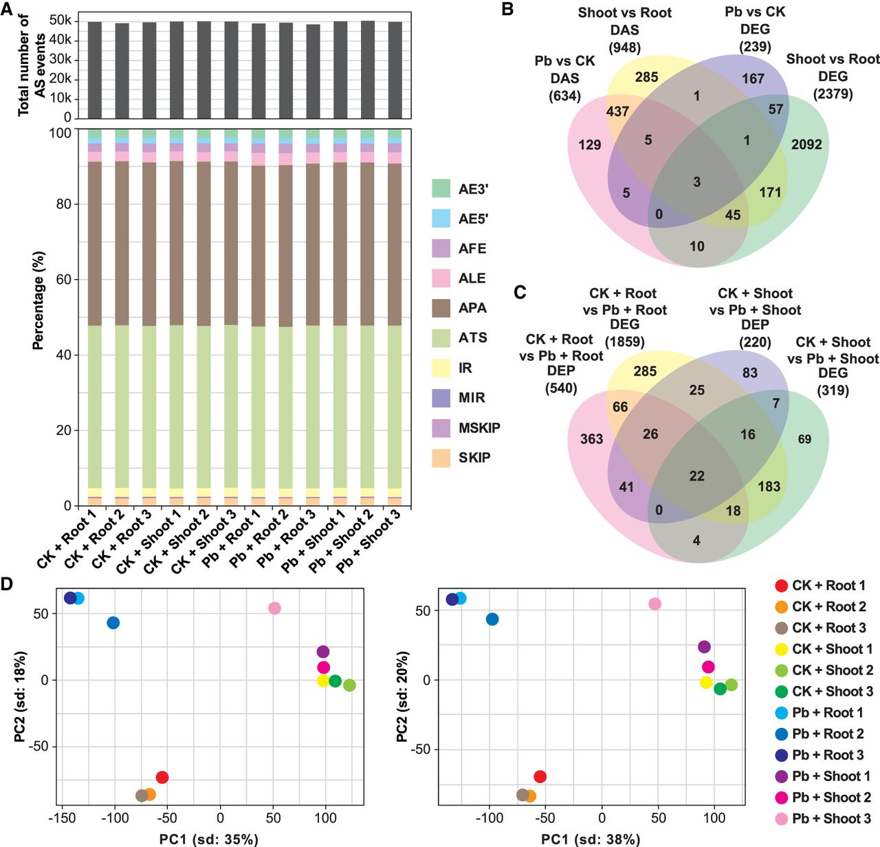 Bioinformatic comparison of the data sets of DEGs and genes subjected to DAS. (A) Summary of the total number and types of AS events identified. Data from each biological replicate are shown. (B,C) Venn diagrams displaying the common and unique genes between the data sets of DEGs and genes subjected to DAS and between the data sets of DEPs and DEGs. (D) Principal component analysis (PCA) of all 12 samples, which were divided into four groups. ALE, alternative last exon; AFE, alternative first exon; SKIP, exon skipping; MSKIP, multiple exon skipping; MIR, multiple intron retention; IR, intron retention. Group 1, CK shoots versus CK roots; Group 2, Pb roots versus CK roots; Group 3, Pb shoots versus CK shoots; Group 4, Pb shoots versus Pb roots; CK, control sample grown in the absence of Pb; Pb, sample grown in the presence of Pb.