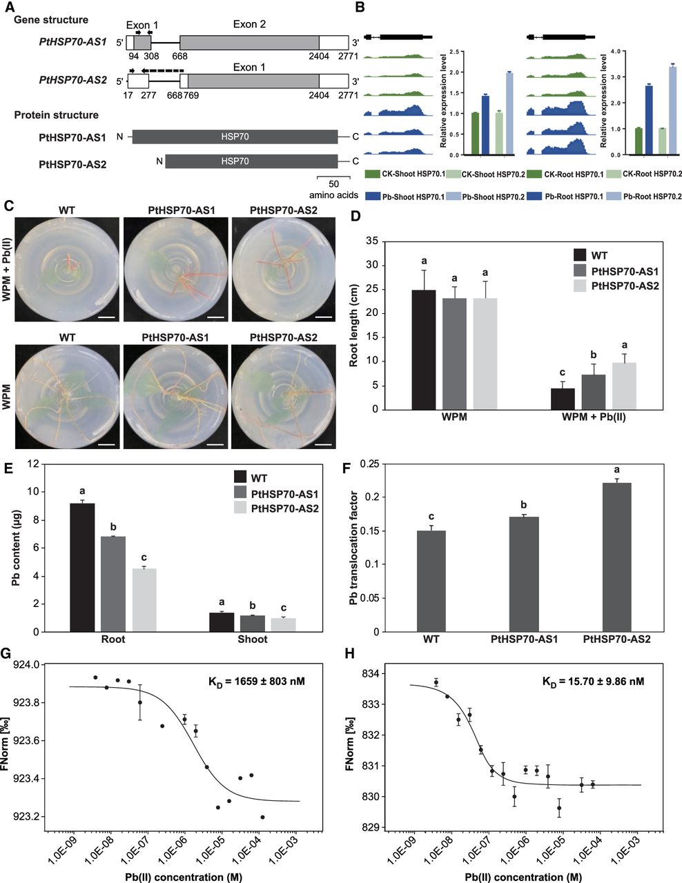 Gene and protein structure and expression of PtHSP70, and phenotypic analysis of transgenic poplar overexpressing PtHSP70-AS1 and PtHSP70-AS2. (A) Gene and protein structures of PtHSP70-AS1 and PtHSP70-AS2. Dotted line, the reverse primer of PtHSP70-AS2 is a splicing junction primer that span the intron. The reverse primer of PtHSP70-AS1 starts at the exon which PtHSP70-AS2 does not have. (B) RNA-seq read mapping data for RefSeq annotated gene regions for PtHSP70 and the expression of PtHSP70-AS1 and PtHSP70-AS2 in wild-type poplar treated and not treated with Pb. (C) Phenotype of transgenic poplar overexpressing PtHSP70-AS1 and PtHSP70-AS2 after Pb treatment. (D) Root length of transgenic poplar overexpressing PtHSP70-AS1 and PtHSP70-AS2 after Pb treatment. (E) Pb contents of transgenic poplar overexpressing PtHSP70-AS1 and PtHSP70-AS2 after Pb treatment. (F) Pb translocation factors of transgenic poplar overexpressing PtHSP70-AS1 and PtHSP70-AS2 after Pb treatment. The letters represent significant differences between the WT and transgenic lines (ANOVA, P < 0.05). CK, control sample grown in the absence of Pb; Pb, sample grown in the presence of Pb; WT, wild type; PtHSP70-AS1, transgenic poplar overexpressing PtHSP70-AS1; PtHSP70-AS2-1, transgenic poplar overexpressing PtHSP70-AS2. (G,H) Binding affinity between Pb(II) and recombinant PtHSP70-AS1 (G) and PtHSP70-AS2 (H) determined by MST binding assay. The values represent the means ± SDs (n = 3).