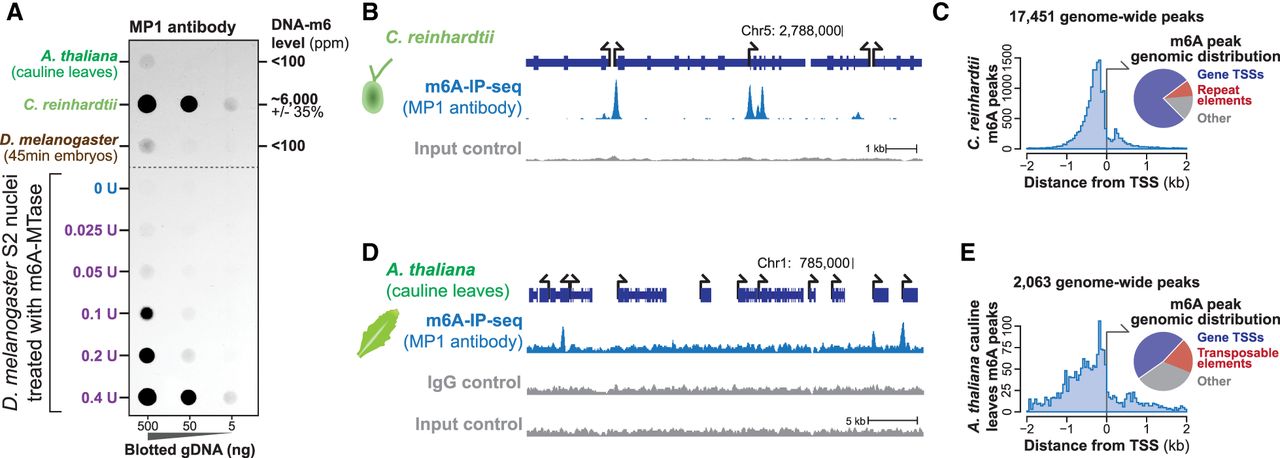 Detection of endogenous DNA-m6A across three nonmammalian eukaryotes. (A) DNA dot-blot quantifying the relative amount of DNA-m6A in samples from three eukaryotes, as well as from S2 cell nuclei treated with increasing amounts of m6A-MTase. To the right are the observed amount of DNA-m6A in samples relative to Figure 1D. (B) Genomic locus from C. reinhardtii comparing the relationship between m6A-DIP-seq signal and input control signal. The y-axis is identical for both experiments. (C) Histogram (left) and pie chart (right) showing the distribution of identified C. reinhardtii DNA-m6A peaks relative to TSSs and repetitive elements. (D) Genomic locus from A. thaliana comparing the relationship between m6A-DIP-seq signal and input and IgG control signal. The y-axis is identical for all experiments. (E) Histogram (left) and pie chart (right) showing the distribution of identified A. thaliana DNA-m6A peaks relative to TSSs and repetitive elements.