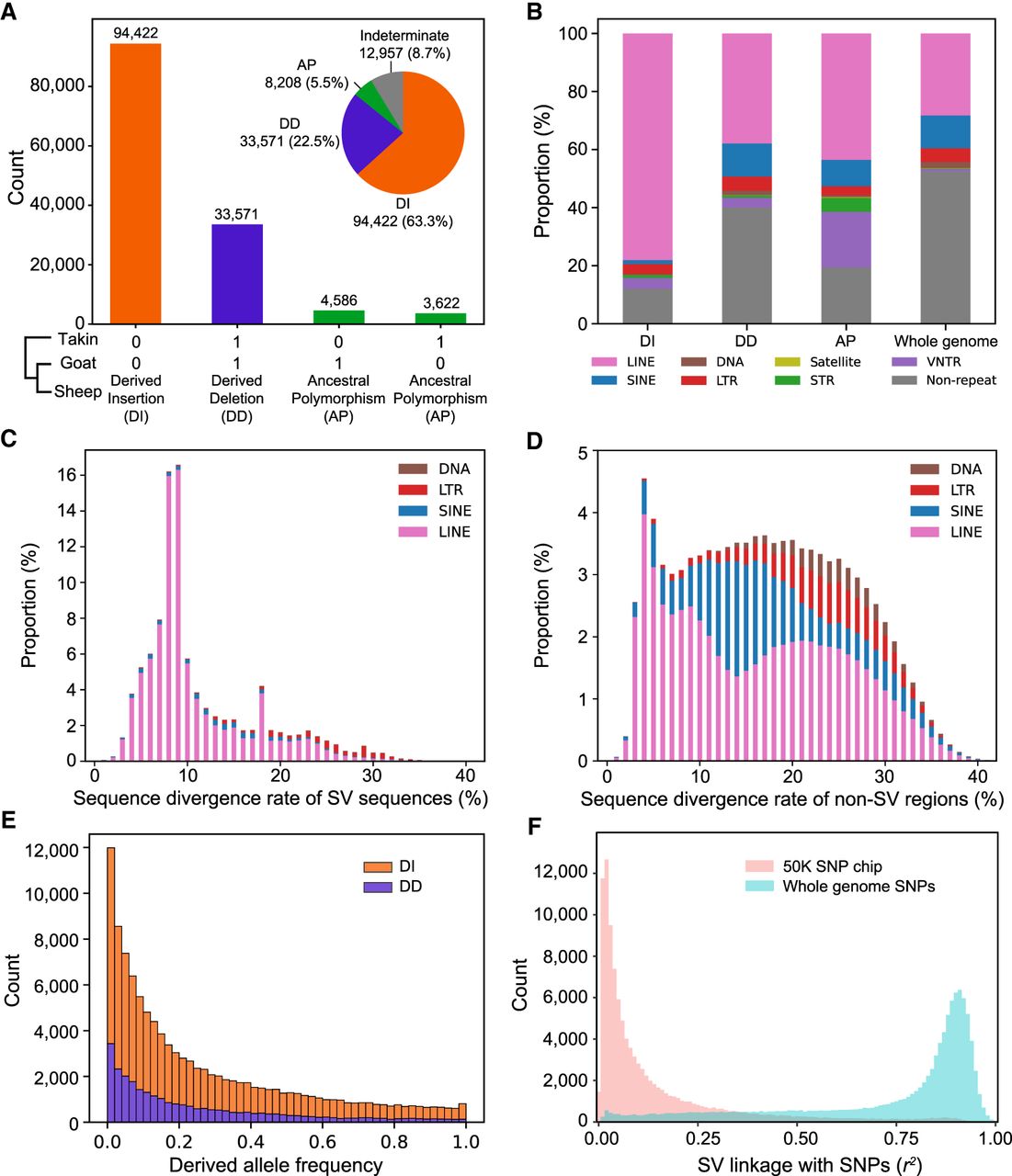 Inference of derived state for SVs using takin and goat as outgroups. (A) Each SV is assigned to a derived state of either derived insertion, derived deletion, ancestral polymorphism, or indeterminate based on their presence (“1”) and absence (“0”) status in outgroup. (B) Repeat annotation in three types of dSVs. (C) Sequence divergence rate (%) of TE repeats within SV sequences. (D) Sequence divergence rate (%) of TE repeats in non-SV genomic regions. (E) dSV allele frequency spectrum. (F) Linkage analysis between SVs and nearby SNPs of whole genome (±50 kb) and ovine 50K SNP chip (±500 kb). Those SVs with MAF > 0.01 were used for linkage analysis.