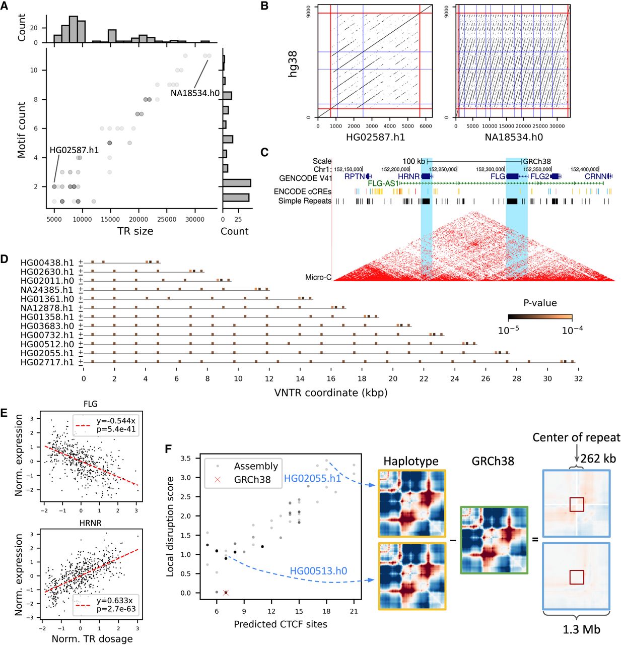 HRNR repeat expansion impacts nearby gene expression. (A,B) VNTR allele diversity of the HRNR repeat (Chr 1: 152,213,243–152,221,044). (A) The VNTR lengths and counts for motif AGGAGTGCCCCAAACCGGACCCATGTCGGCCG in the HGSVC and HPRC assemblies are shown (matplotlib alpha = 0.2). (B) Two divergent haplotypes in A are highlighted with dot plots. Red lines indicate the boundary of the repeat, flanked by 700-bp sequences on both sides. The locations of the motif in GRCh38 and assemblies are shown as blue lines. Each dot denotes an exact match of 21-mers. (C) UCSC Genome Browser (Kent et al. 2002) view of HRNR, FLG, and FLG-AS1. Blue, red, and yellow lines in the ENCODE cCRE track denote CTCF sites, promoters, and enhancers, respectively. Micro-C chromatin structure from HFFc6 cell line is shown. HRNR and FLG are highlighted in light blue. (D) Predicted CTCF binding sites across 13 length-divergent haplotypes. Each haplotype was scanned for matches with a 34-bp, two-core CTCF motif (MA1929.1) using FIMO with a cutoff of P < 10–4. Plus and minus signs at the start of each haplotype indicate the orientation of the motif. (E) Association of the estimated HRNR repeat size in GTEx genomes with FLG (in fibroblast) and HRNR (in thyroid) expression. Red dashed lines indicate the best fit under simple linear regression. (F, left) The number of predicted CTCF sites versus disruption of local genome folding predicted by Akita for alternate VNTRs among 83 assemblies. Each variant VNTR is shown as a gray dot with a shade reflecting the multiplicity of alleles that have the similar numbers of CTCF sites and disruption scores. A higher local disruption score reflects greater changes in contact frequencies relative to GRCh38 in a 262-kb window. (Right) Illustration of how a local disruption score is calculated comparing predicted folding in a haplotype to GRCh38.