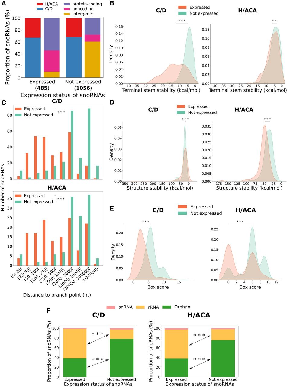 Characterization of human snoRNA features according to their expression status. (A) Proportion of expressed and not expressed snoRNAs as a function of the snoRNA type (left bar of each pair) and the host gene biotype (right bar of each pair). The number of expressed and not expressed snoRNAs are displayed in parentheses under the bars. (B) Distribution of terminal stem stability (in kcal/mol) for C/D and H/ACA box snoRNAs per expression status. The distributions are statistically different: Mann–Whitney U test; (***) P < 8 × 10−79 and (**) P < 0.01, respectively, for C/D and H/ACA box snoRNAs. (C) Distribution of the number of expressed and nonexpressed intronic snoRNAs per snoRNA type according to their distance to the branchpoint: Mann–Whitney U test; (***) P < 6 × 10−80 and (***) P < 8 × 10−36 for C/D and H/ACA box snoRNAs, respectively. (D) Distribution of the snoRNA structure stability (in kcal/mol) per expression status and snoRNA type: Mann–Whitney U test; (***) P < 0.001 and (***) P < 2 × 10−23 for C/D and H/ACA box snoRNAs, respectively. (E) Distribution of snoRNA box score depending on the expression status and snoRNA type: Mann–Whitney U test; (***) P < 4 × 10−80 and (***) P < 4 × 10−19, respectively, for C/D and H/ACA box snoRNAs. (F) Bar charts displaying the proportion of snoRNAs per expression status for C/D (left panel) and H/ACA box (right panel) snoRNAs according to their target: Fisher's exact test; (***) P < 2 × 10−38 and (***) P < 4 × 10−15 for C/D and H/ACA box snoRNAs, respectively.