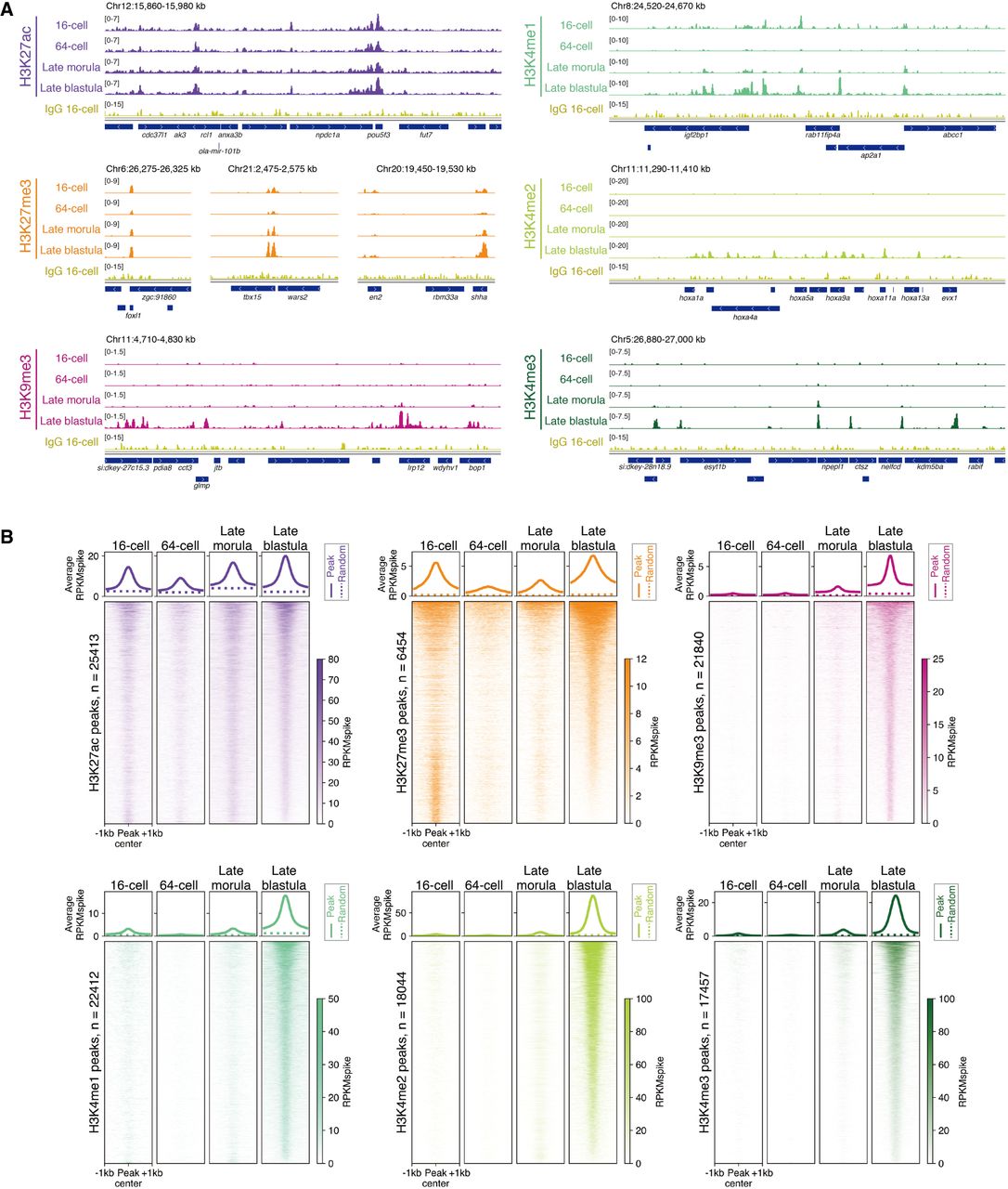 Erasure and retention of histone modifications in early-stage medaka embryos quantitatively revealed by spike-in ChIP-seq. (A) Track views showing representative patterns of each histone modification and IgG control. Enrichment levels of histone modifications after spike-in normalization or that of IgG before spike-in normalization are shown. (B) Genome-wide changes in enrichment of each modification. The average enrichment levels after spike-in normalization (RPKMspike) around all peaks and randomized peaks at each stage are shown as solid lines and dashed lines, respectively (top). Heatmaps showing enrichment levels (RPKMspike) around all peaks (±1 kb from peak center).