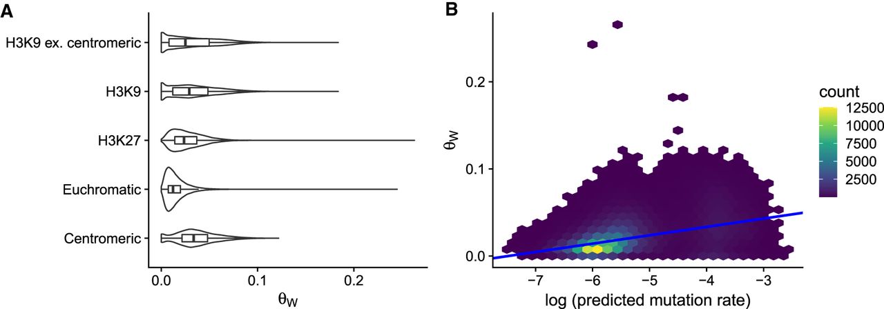 Natural genetic diversity and mutation rate. (A) Nucleotide polymorphism, θW, was calculated across the genome in 200-bp windows, n = 202310. Violin plots overlaid with boxplots for the distribution of θW in different domains. (B) Relationship with θW and predicted mutation rate. For plotting, data were binned into hexes because of the high number of overlapping points, and the number of windows falling into each hex is shown by the legend.