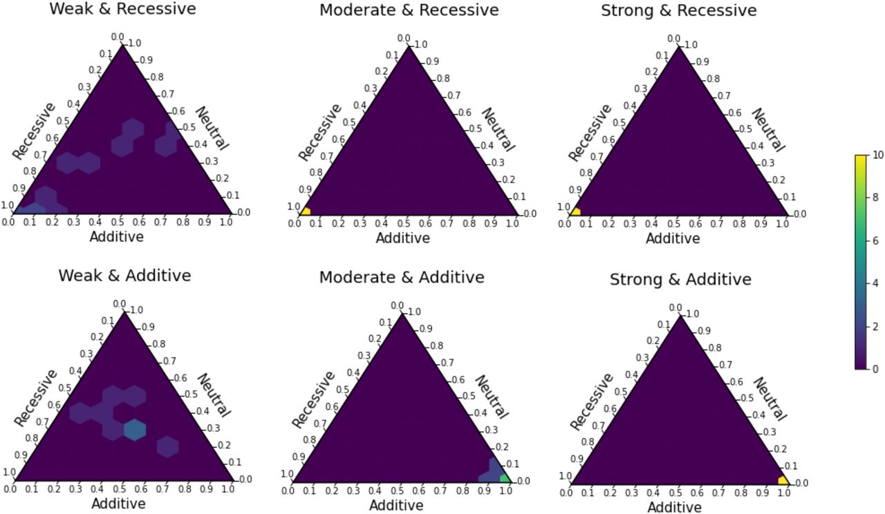 TIDES can accurately distinguish among neutral, recessive, and additive models of selection. True models are shown above each simplex (weak: s = −0.0001; moderate: s = −0.001; strong: s = −0.01; recessive: h = 0; additive: h = 0.5). The coordinates along each axis denote posterior probabilities assigned to the respective model. The color of each tile represents the proportion of simulations that fall within that probability bin (scale shown at far right).