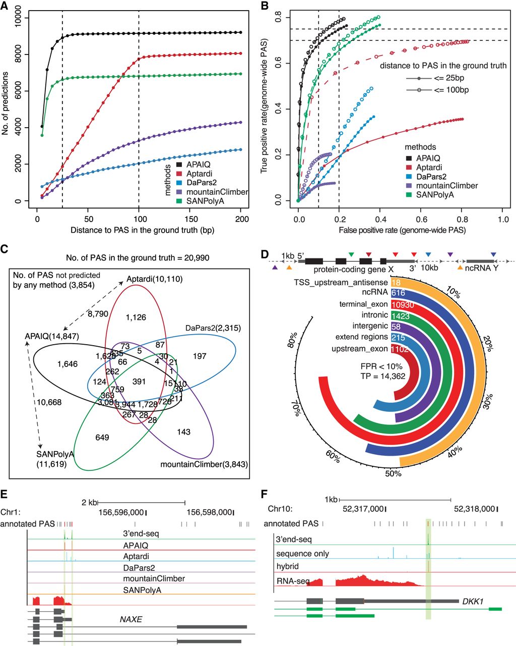 APAIQ outperforms other methods on PAS identification. (A) Number of the top 10,000 predicted PASs within different distances from the PAS in the ground truth. (B) ROC curves showing the performance of the APAIQ and four other published methods, including Aptardi, DaPars2, mountainClimber, and SANPolyA. (C) Venn diagram showing the number of true positives predicted by APAIQ and the four published methods. The number of overlaps between APAIQ and Aptardi, APAIQ, and SANPolyA were indicated by arrows. (D) Different categories of the PAS identified by APAIQ. (E) An example showing that the IPA event was successfully identified by APAIQ, but not the other three methods. (F) Genome Browser showing predictions of PAS from the genes DKK1 based on the hybrid model integrating DNA sequence and RNA-seq coverage, the model only using DNA sequence (sequence-only), and the model only using RNA-seq coverage (coverage-only).