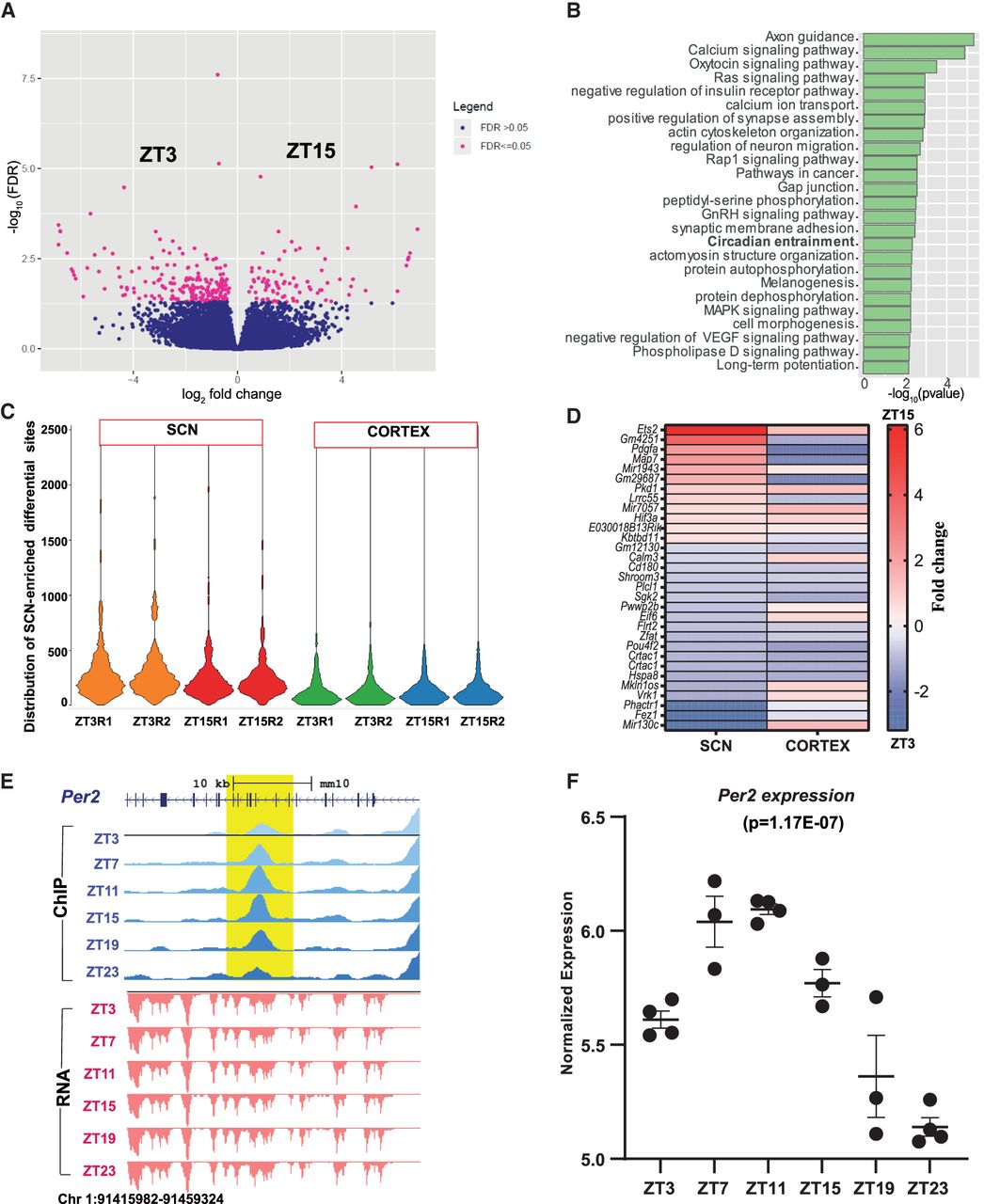 Dynamic H3K27ac occupancy based on time of the day. (A) Volcano plot showing fold change and FDR for differential H3K27ac sites in the SCN between ZT3 and ZT15 (n = 293) as computed by Diffbind. (B) Functional annotation of nearest gene (TSS) from differential (ZT3 vs. ZT15) H3K27ac sites using GO (biological process) and KEGG pathway (DAVID). (C) Violin plot showing distribution of differential H3K27ac peaks at ZT3 and ZT15 in the SCN and cortex: (R1) replicate 1, (R2) replicate 2. (D) Heat map view of differential H3K27ac sites (ZT3 vs. ZT15) observed in both the SCN and cortex. (E) UCSC Genome Browser tracks for H3K27ac intragenic peak (blue with shaded yellow) at the Per2 gene locus showing ZT11 and ZT23 differential peak (fold change = 1.7) along with the gene expression tracks (red) across six time points (ZT3–ZT23) arising from the negative strand. (F) Normalized gene expression level of the Per2 gene across six distinct time points, cycling with a peak at ZT11 and a trough at ZT23; Pearson's correlation (H3K27ac peak and gene expression) = 1.