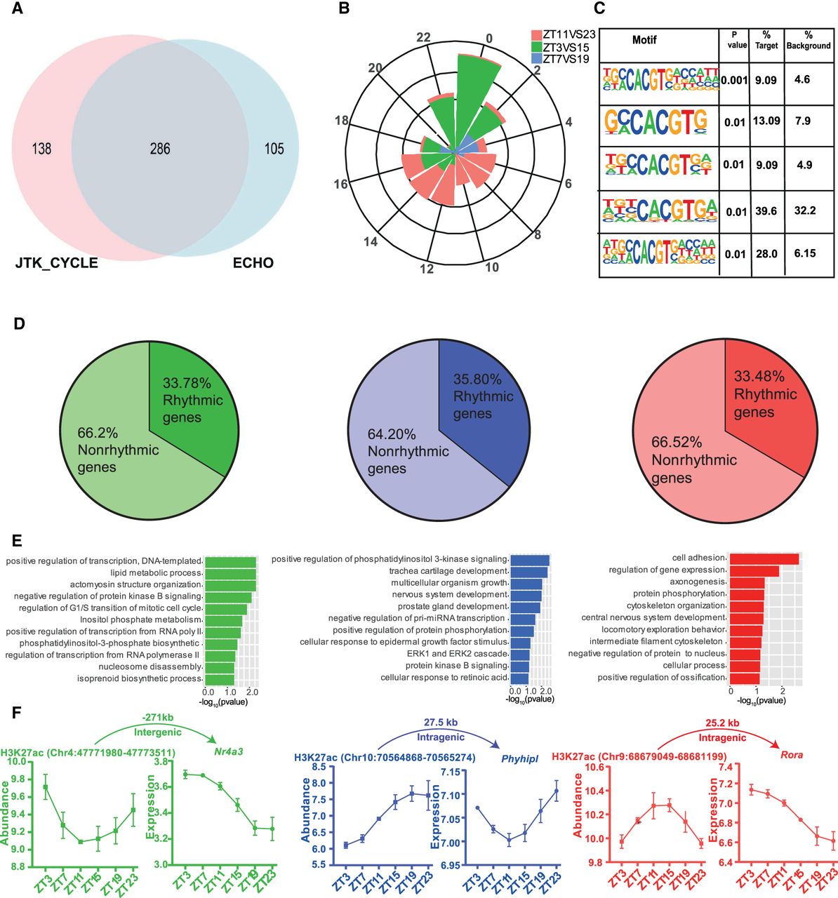Rhythmic H3K27ac occupancy linked to cycling gene expression in the SCN. (A) Venn diagram showing overlap of rhythmic H3K27ac abundance as analyzed by ECHO and JTK_CYCLE in the SCN. (B) Phase distribution of cycling H3K27ac peaks that were found differential in ZT3 versus ZT15 (green), ZT7 versus ZT19 (blue), and ZT11 versus ZT23 (red) groups denoted by a rose plot. (C) Overrepresentation of the E-box motif (CACGTG) in oscillating H3K27ac sites (HOMER). (D) Proportion of rhythmic genes mapped adjacent to rhythmic H3K27ac regions for each phase separated enhancer group. (E) Functional annotation of rhythmic genes found in close proximity of cycling H3K27ac abundance, peaking at distinct time (ZT), using GO (biological process) and KEGG pathway (DAVID). (F) Representative examples of rhythmic H3K27ac and target gene expression (P < 0.05) with distance to TSS and genomic location shown at top.