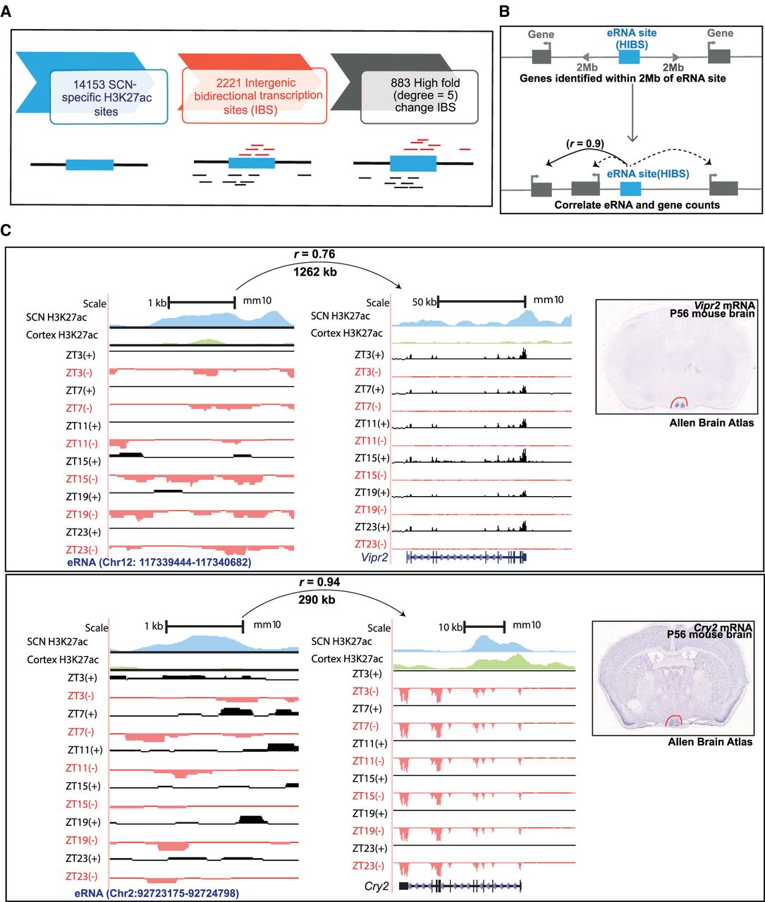 Identification of actively transcribing SCN enhancers (eRNAs). (A) Analysis pipeline for identification of actively transcribing enhancers. (B) eRNA–gene pairs were determined by correlation of eRNA and gene expression levels within a 2-Mb distance cutoff. (C) UCSC Genome Browser tracks showing enhancer-linked H3K27ac signal (normalized ChIP-seq coverage) for cortex (green) and SCN (blue) peaks and total RNA expression (reads mapped to + [black] and – [red] strand) signal as normalized CPM value for two representative examples, that is, Vipr2 and Cry2. The distance between eRNA and predicted target gene with Pearson's correlation is indicated above each represented eRNA–gene pair. SCN expression of the respective target gene is also evident in in situ hybridization images from adult mouse brain (right; image credit: Allen Brain Atlas, Allen Institute).