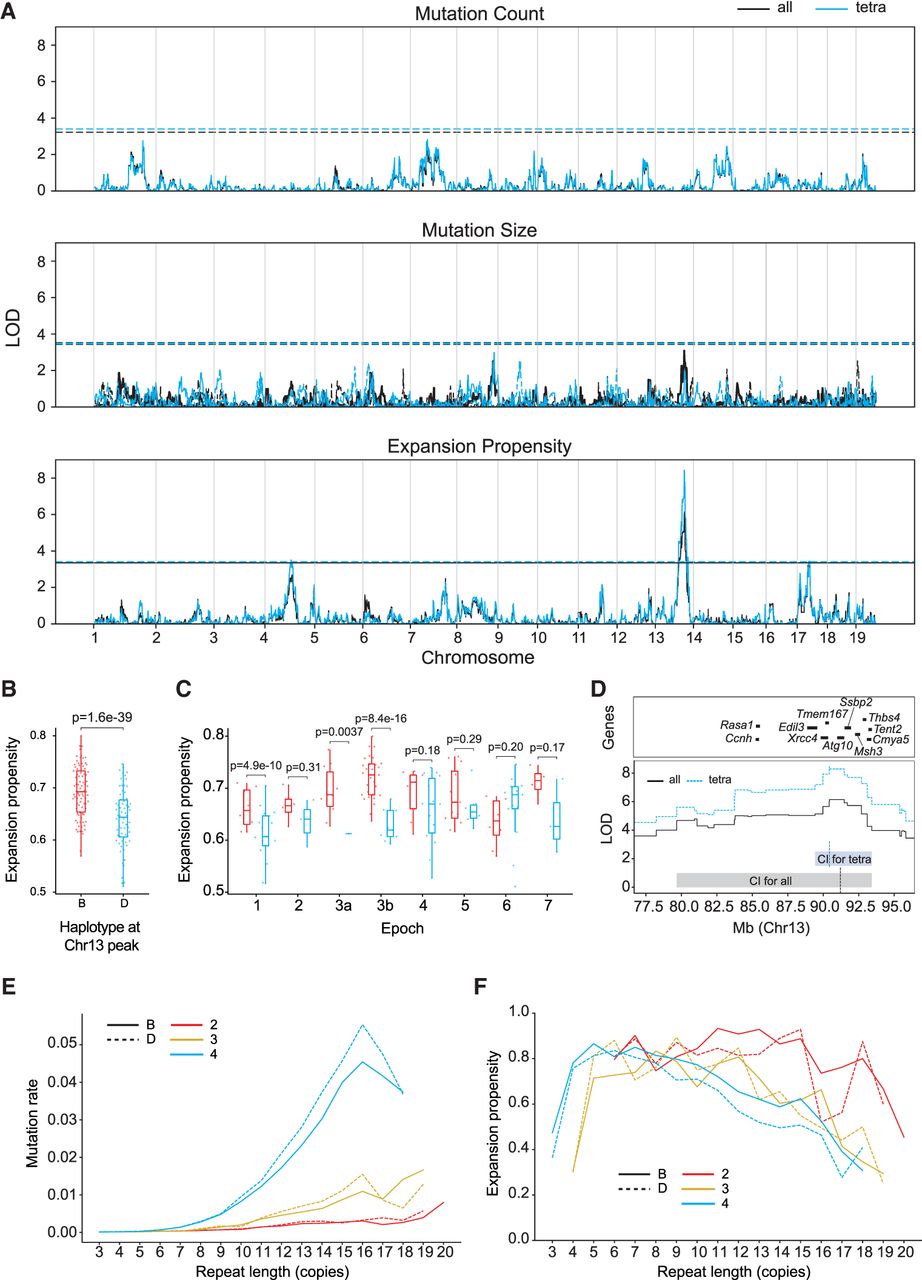 Discovery of QTLs for STR mutation phenotypes. (A) QTL mapping results. Panels show results for mutation count (top), mutation size (middle), and expansion propensity (bottom). The x-axis shows the genomic location, and the y-axis shows the LOD score of each SNP. For mutation size, solid traces and dashed traces represent contraction and expansion mutations, respectively. For each panel, black indicates the phenotype based on all STRs; blue, the phenotype based on tetranucleotide STRs only. Dashed horizontal lines show genome-wide significance thresholds based on permutation analyses. (B,C) Increased expansion propensity is associated with the B haplotype at the Chr 13 QTL. Each point represents one strain. We used SNP haplotype blocks to assign each strain as harboring either the B (red) or D (blue) haplotype at this locus. The y-axis denotes expansion propensity. Panel B shows the trend across all BXD strains, and panel C shows the trend separately for each epoch. Horizontal lines show median values; boxes span from the 25th percentile (Q1) to the 75th percentile (Q3). Whiskers extend to the minimum and maximum data points in each group. For panels B and C, annotated P-values are based on a two-sided z-proportion test. (D) Genes located in or near the QTL peak. The y-axis shows the QTL signal (LOD score) for expansion propensity at Chr 13. Black line indicates all STRs; blue line, tetranucleotide STRs. Shaded boxes indicate the 1.5-LOD confidence interval for all STRs (gray box) and tetranucleotides (light blue box). Horizontal bars denote a subset of genes near the center of the QTL peak. A full list of genes in this region is given in Supplemental Table S1. (E) Repeat length versus relative mutation rate. The x-axis gives the repeat length of each STR based on the parent haplotype at each locus in each strain. The y-axis gives the relative mutation rate of STRs in each bin, computed as the number of mutations divided by the total number of nonmissing genotype calls falling in each bin. (F) Repeat length versus expansion propensity. The x-axis is the same as in E. The y-axis gives the proportion of mutations observed in each bin that are expansions. For E and F, red indicates dinucleotides; gold, trinucleotides; and blue, tetranucleotides. Dashed lines indicate D haplotype; solid lines, B haplotype at the Chr 13 QTL locus.