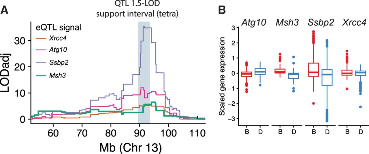 The Chr 13 expansion propensity QTL colocalizes with eQTLs for multiple DNA repair genes. (A) Colocalization of expansion propensity and eQTL signals. Colored traces denote eQTL LOD scores. Each line shows the expression data set with the strongest eQTL for that gene. eQTL LOD scores were adjusted for multiple hypothesis testing for each gene based on the number of probes tested. The gray shaded box shows the 1.5-LOD support interval for the expansion propensity QTL based on tetranucleotide STRs. (B) Distribution of gene expression for strains with B versus D haplotypes. Panels show gene expression for each gene for strains assigned the B (red) versus D (blue) haplotypes at the QTL locus. Data shown are aggregated across all GeneNetwork data sets with a significant eQTL for each gene. Distributions per data set are shown in Supplemental Figure S20.