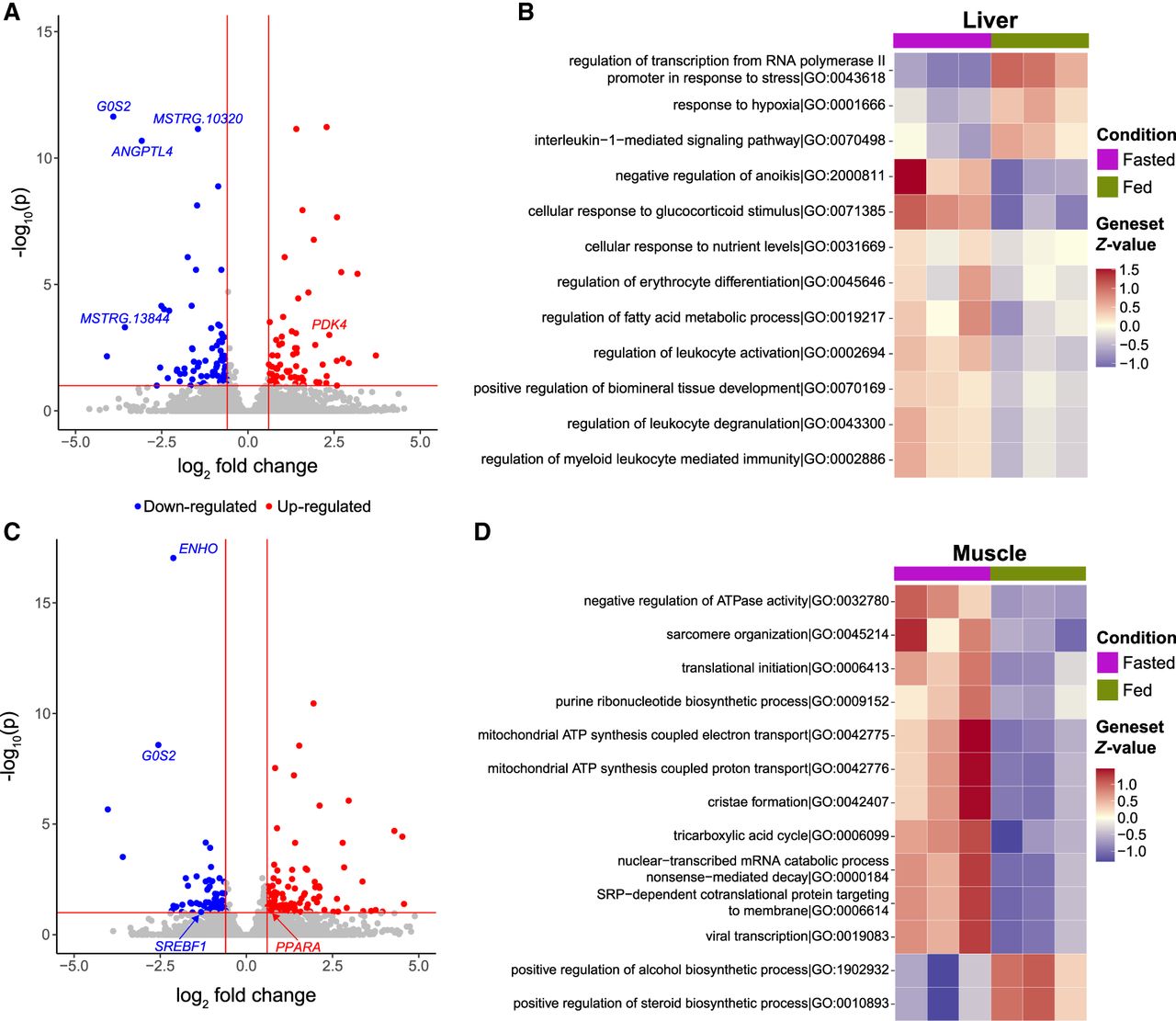 Differential expression. (A) Volcano plot displaying differentially expressed genes (DEGs) from A. colubris liver tissue comparing fasted to fed. (B) Summary heatmap of top 12 enriched GO terms in the liver. (C) Volcano plot displaying DEGs from A. colubris muscle tissue comparing fasted to fed. (D) Summary heatmap of top 13 enriched GO terms in the muscle.