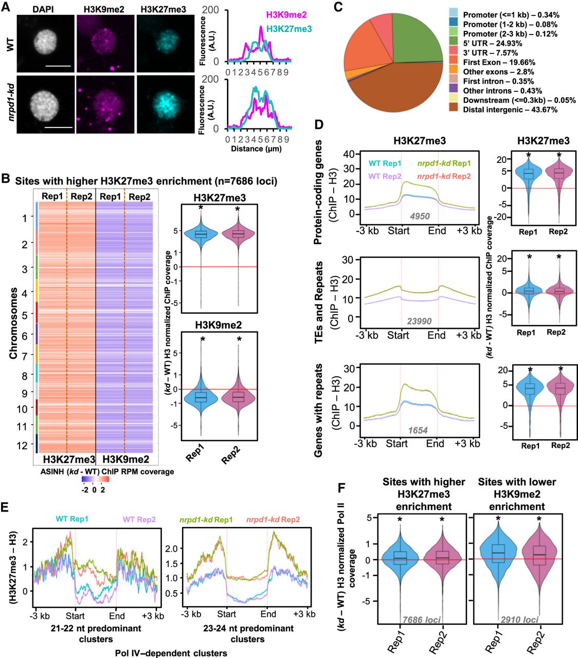 Pol IV maintains the genome-wide distribution of H3K27me3-mediated silencing states. (A) Immunostaining images of H3K27me3 and H3K9me2 marks in the nuclei extracted from WT and kd seedlings. DAPI-stained DNA. Scale bar: 5 µm. At least 30 nuclei from each genotype were examined. Fluorescence signals over the regions of interest are plotted. Regions of interest are also shown in Supplemental Figures S8 and S9. (B) Chromosome-resolved heatmaps showing the levels of difference in H3K9me2 enrichment at sites with higher H3K27me3 enrichment in kd compared with WT. Box-violin plots show the distribution of the differences in H3K9me2 and H3K27me3 levels. The y-axis is scaled to the inverse sine hyperbolic function of differences. (C) Pie chart showing the feature annotation of the sites shown in B. All the sites that do not fall in the ±3-kb windows of genes were categorized as distal intergenic regions. (D) Metaplots showing the levels of H3K27me3 enrichment (normalized to H3) over the annotated features overlapping with the identified H3K27me3 peaks. Numbers in gray depict the number of loci. Box-violin plots show the difference in enrichment in kd compared with the WT. The y-axis is scaled to the inverse sine hyperbolic function of H3 ChIP-normalized values. (E) Metaplots showing the abundance normalized enrichment of H3K27me3 marks w.r.t. H3 over the Pol IV–dependent sRNA clusters size categorized as 21- to 22-nt and 23- to 24-nt predominant clusters. (F) Box-violin plots showing the difference in Pol II coverage over the H3K27me3 higher-enriched sites and H3K9me2 lower-enriched sites in kd compared with the WT. Numbers in gray describe the number of loci taken for analyses. The y-axis is scaled to inverse sine hyperbolic function of enrichment values. (B,D,F) A Mann–Whitney U test was used to test statistical significance against WT Rep1. (*) P-value < 0.0001.