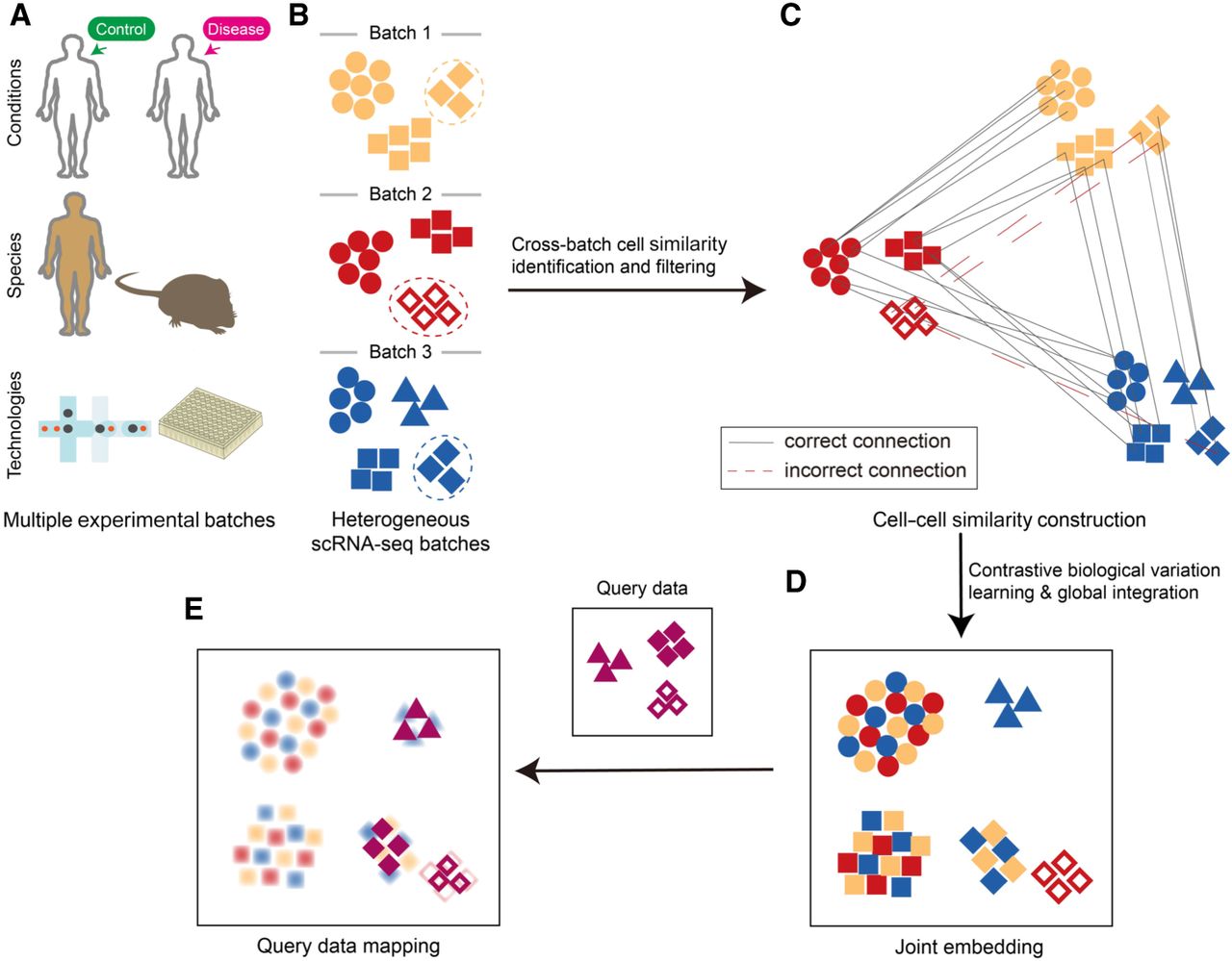 Overview of the scInt method. (A) scInt integrates multiple scRNA-seq batches that may come from different conditions, species, or technologies. (B) Three heterogeneous batches. Batches and cell types are represented by different colors and shapes, respectively. The dashed cell groups represent the same cell types with different transcriptomic states. (C) Cell–cell similarity construction. Similarities based on a cluster-specific exponential kernel are identified and further filtered in the cPCA space. (D,E) Integration and reference-based mapping of multiple batches. A unified contrastive biological variation learning framework is used for integration (D) and reference-based mapping (E).