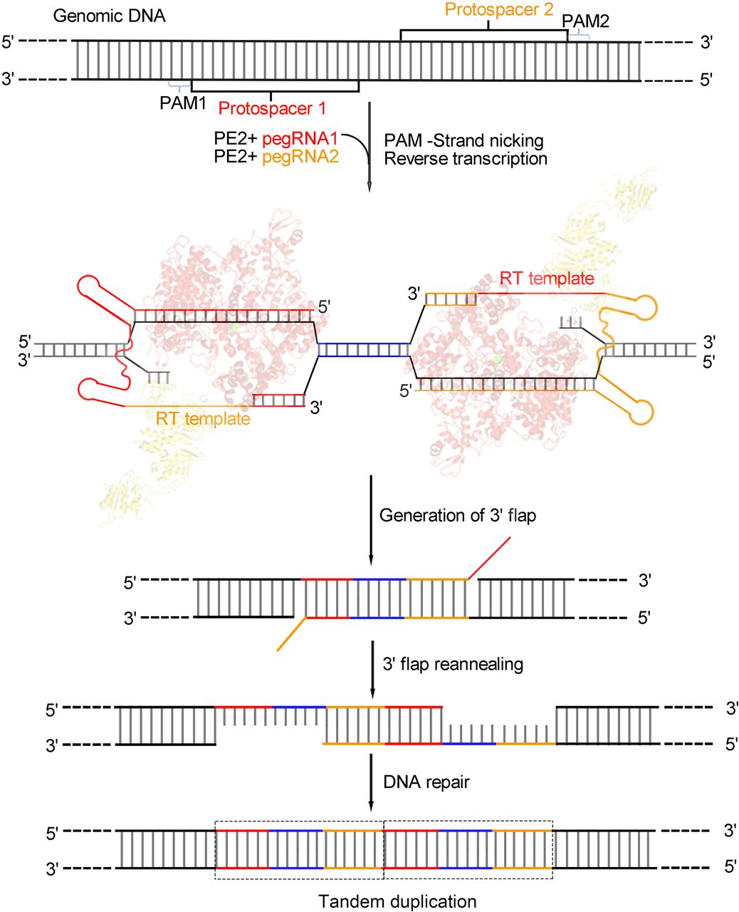 Overview of editing strategies for TD-PE. Schematic diagram showing the design and the putative editing process of TD-PE strategy. The TD-PE strategy contains a pair of in trans pegRNAs, pegRNA1 and pegRNA2, which are shown in red and orange, respectively. Each pegRNA contains an RT-template that is homologous to the sequence of the 5′ end or 3′ end of the fragment to be duplicated. These homologous regions are marked by colors that are the same as their corresponding pegRNAs. A blue line indicates the fragment between the homologous region. The prime edited ssDNA strands reannealed to form an intermediate that contains partial tandem duplication (TD), which was then repaired by endogenous DNA repair mechanisms to accomplish the TD.