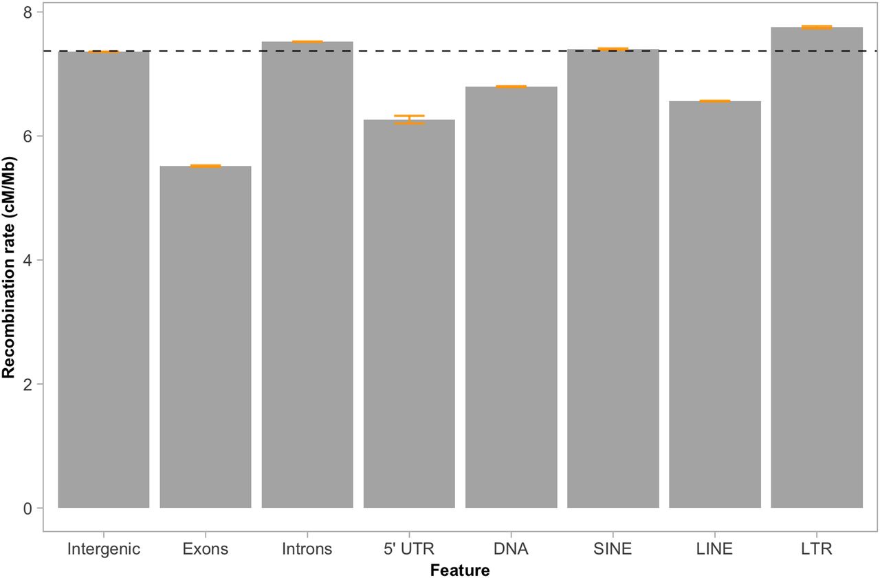 Recombination rate estimates in different gene elements and classes of transposable elements. The genome-wide recombination rate (7.37 cM/Mb) is indicated with the horizontal black dashed line. Orange bars indicate 95% confidence intervals.