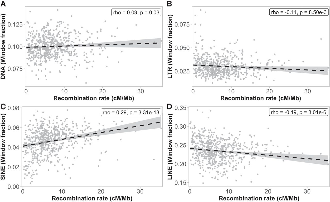 Associations between the recombination rate (1-Mb scale) and the proportion of four different TE classes; (A) DNA transposons, (B) LTRs, (C) SINEs, and (D) LINEs. The abundance of TEs was calculated as the fraction of each 1-Mb window occupied by each specific element.
