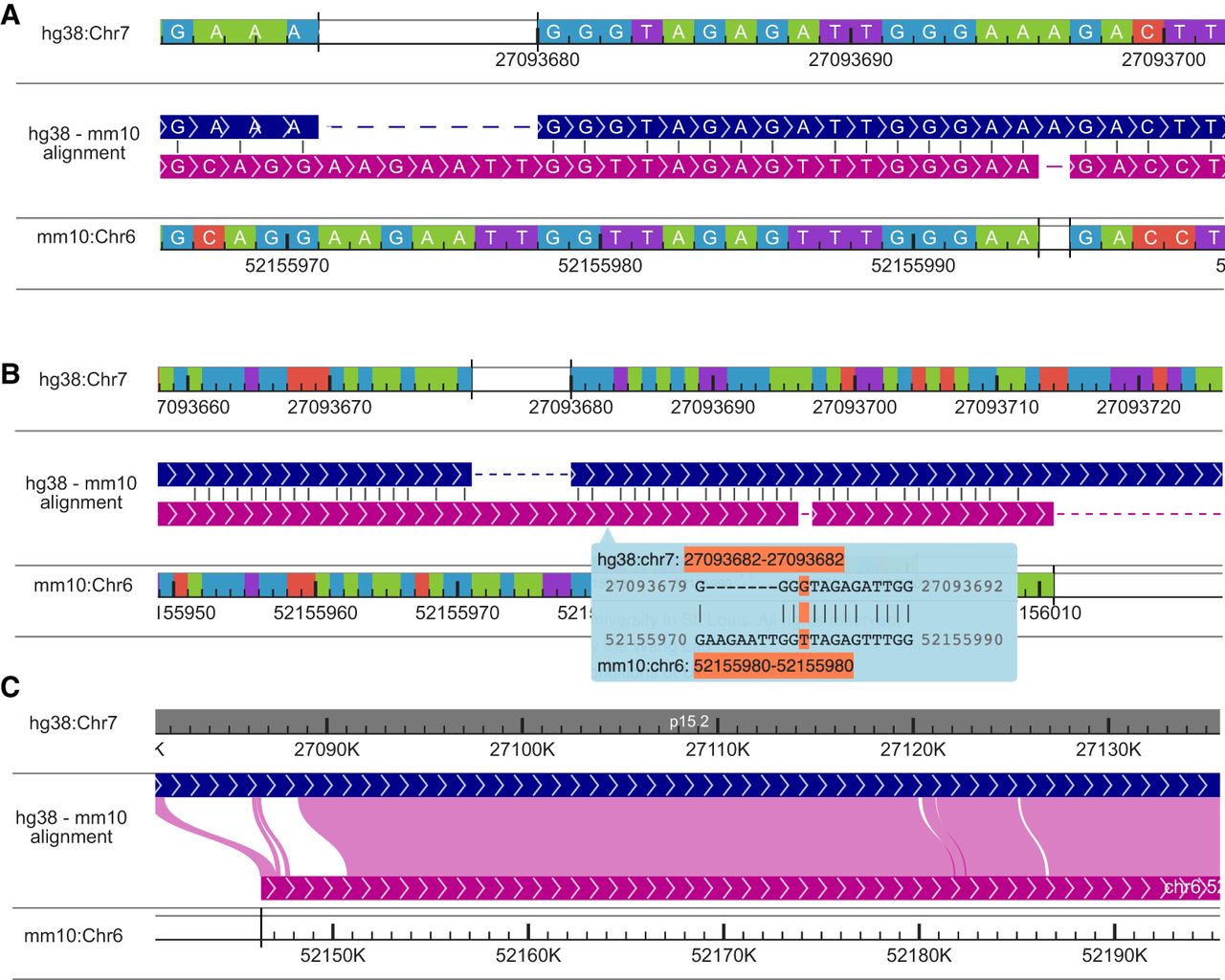 Displaying genome alignments using the WashU Comparative Epigenome Browser. (A) Displaying hg38-mm10 BLASTZ alignment at the nucleotide level with more than 10 pixels per nucleotide. The sequence strand in the alignment is illustrated using arrows. Syntenic nucleotides from hg38 and mm10 are vertically aligned with gaps inserted. Matching nucleotides are connected using a short vertical line in the alignment track. (B) Displaying hg38-mm10 alignment between 0.1 pixels per nucleotide and 10 pixels per nucleotide. The alignment is organized the same as in panel A without displaying nucleotides within the alignment. Alignments at nucleotide resolution are visible in the cursor tip hover box, and the nucleotide alignment under the cursor is highlighted in orange (G–T). (C) Displaying alignment with >10 nt per pixel. Both hg38 and mm10 genomes are continuously displayed without breaks. Syntenic regions are connected using pink Bezier curves.