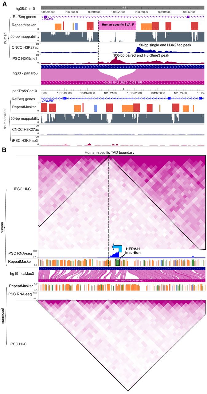 Connecting epigenomic changes with genomic changes using the WashU Comparative Epigenome Browser. (A) RefSeq genes, RepeatMasker, and 50-bp mappability annotations along with H3K27ac ChIP-seq data from cranial neural crest cells (CNCCs) and H3K9me3 ChIP-seq data from iPSCs in both human and chimpanzee were plotted in DNMBP gene region. The H3K9me3 peak in the human-specific SVA insertion indicates epigenomic repression of this element in iPSCs, and the human-specific H3K27ac peak indicates the creation of a putative new CNCC enhancer in the human lineage. (B) Human-specific HERV-H expression is correlated with a new TAD boundary in iPSCs in the human genome compared with the marmoset genome. The iPSC Hi-C contact map, RNA expression, and repeat annotations from human (hg19) and marmoset (calJac3) are compared vertically. HERV-H insertion and expression in the human lineage are associated with a human-specific TAD boundary.