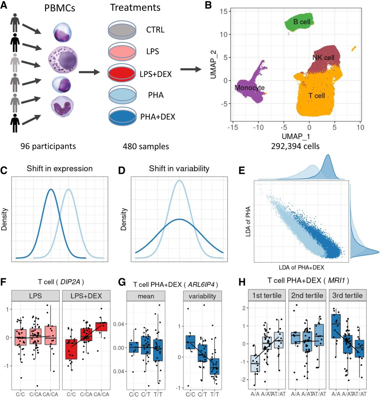 Study overview. (A) PBMCs were collected from 96 African American donors with asthma. Cells were stimulated with phytohemagglutinin (PHA) or lipopolysaccharide (LPS) and treated with glucocorticoid dexamethasone (DEX) for a total of five conditions (including a control), for a total of 480 samples. (B) UMAP visualization of the scRNA data for a total of 293,394 high-quality cells, colored by four major cell types: B cells (green), monocytes (purple), NK cells (maroon), and T cells (orange). (C) Density plot exemplifying changes in mean gene expression between conditions (PHA + DEX vs. PHA). (D) Density plot exemplifying changes in gene variability between conditions (PHA + DEX vs. PHA). (E) Scatterplot representing the low-dimensional manifolds obtained by diagonal linear discriminant analysis (DLDA) in the T cells treated with PHA and PHA + DEX; x-axis denotes the PHA + DEX response pseudotime, and y-axis denotes the PHA response pseudotime. (F) Example of an LPS + DEX response eQTL (reQTL) for DIP2A gene in the T cells. The boxplots depict normalized gene expression levels for the three genotype classes in the two treatment conditions contrasted to identify the reQTL: LPS + DEX (right) and LPS (left). (G) Example of a variability QTL without an effect on the mean gene expression for the ARL6IP4 gene in T cells treated with PHA + DEX. The boxplots depict normalized variability (right) and mean (left) gene expression for the three genotype classes. (H) Example of a DEX response dynamic eQTL for the MRI1 gene in the T cells treated with PHA + DEX.