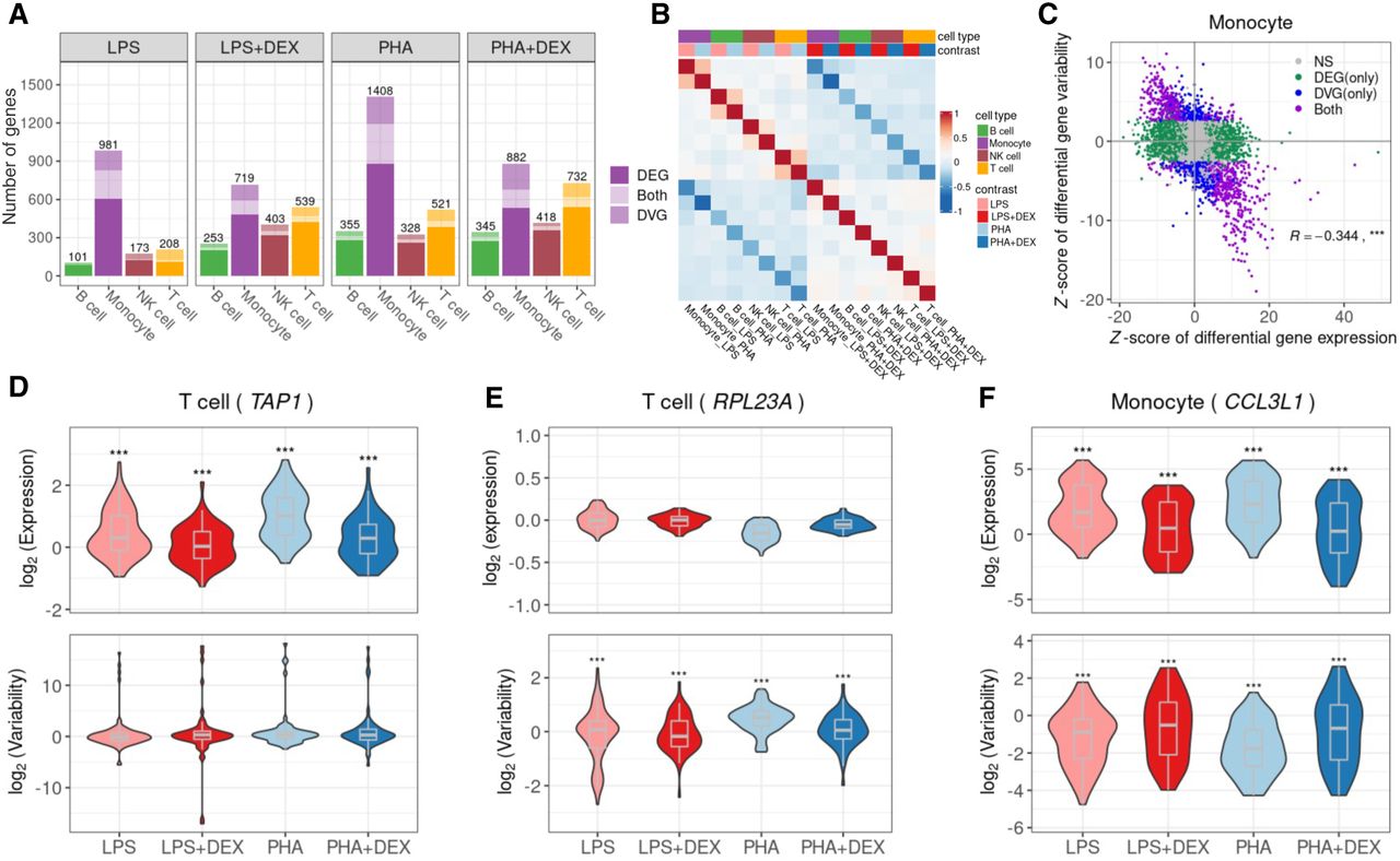 Identification of differentially variable genes (DVGs). (A) Number of the genes with differential mean or variability across cell types and contrasts: genes with significant changes on gene mean only (dark shading), genes with significant changes on gene variability only (medium shading), and genes with significant changes on both gene mean and gene variability (light shading). (B) Heatmap of Spearman's correlation of LFC of gene variability across 16 conditions (four cell types × four contrasts). (C) Scatterplot of the Z-score of differential gene expression (x-axis) and the Z-score of differential gene variability (y-axis) in monocytes across four contrasts. Each dot represents a gene with colors indicating significant (FDR < 10%) changes on gene mean expression only (green), gene variability only (blue), both (purple), and neither (gray). (D) Violin plot of gene expression variability (bottom) and mean expression (top) for the gene (TAP1), an example of a gene that undergoes significant changes only to gene expression in response to immune treatments in T cells. (E) Violin plot of gene expression variability (bottom) and mean expression (top) of the gene (RPL23A), which does not show significant changes in gene expression mean but with significant changes in gene expression variability after immune treatment in T cells. (F) Violin plot of gene expression variability (bottom) and mean expression (top) of the gene (CCL3L1), which shows changes in both gene expression mean and gene expression variability after immune treatment in monocytes.